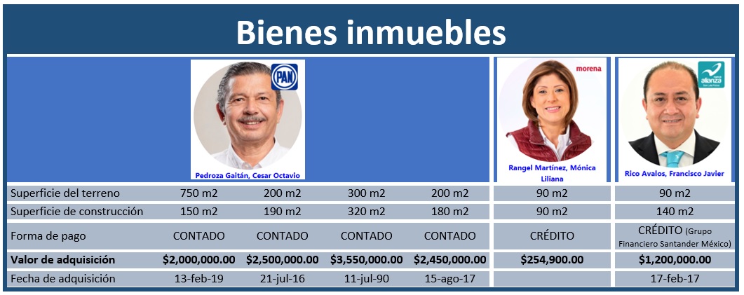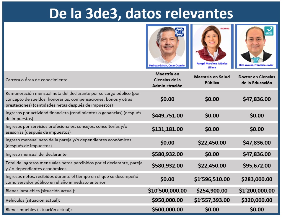 El contraste entre las tres declaraciones patrimoniales de estos candidatos se puede resumir como una situación que varía entre una riqueza inexplicable de Pedroza Gaitán y una pobreza también inexplicable de Rangel Martínez.