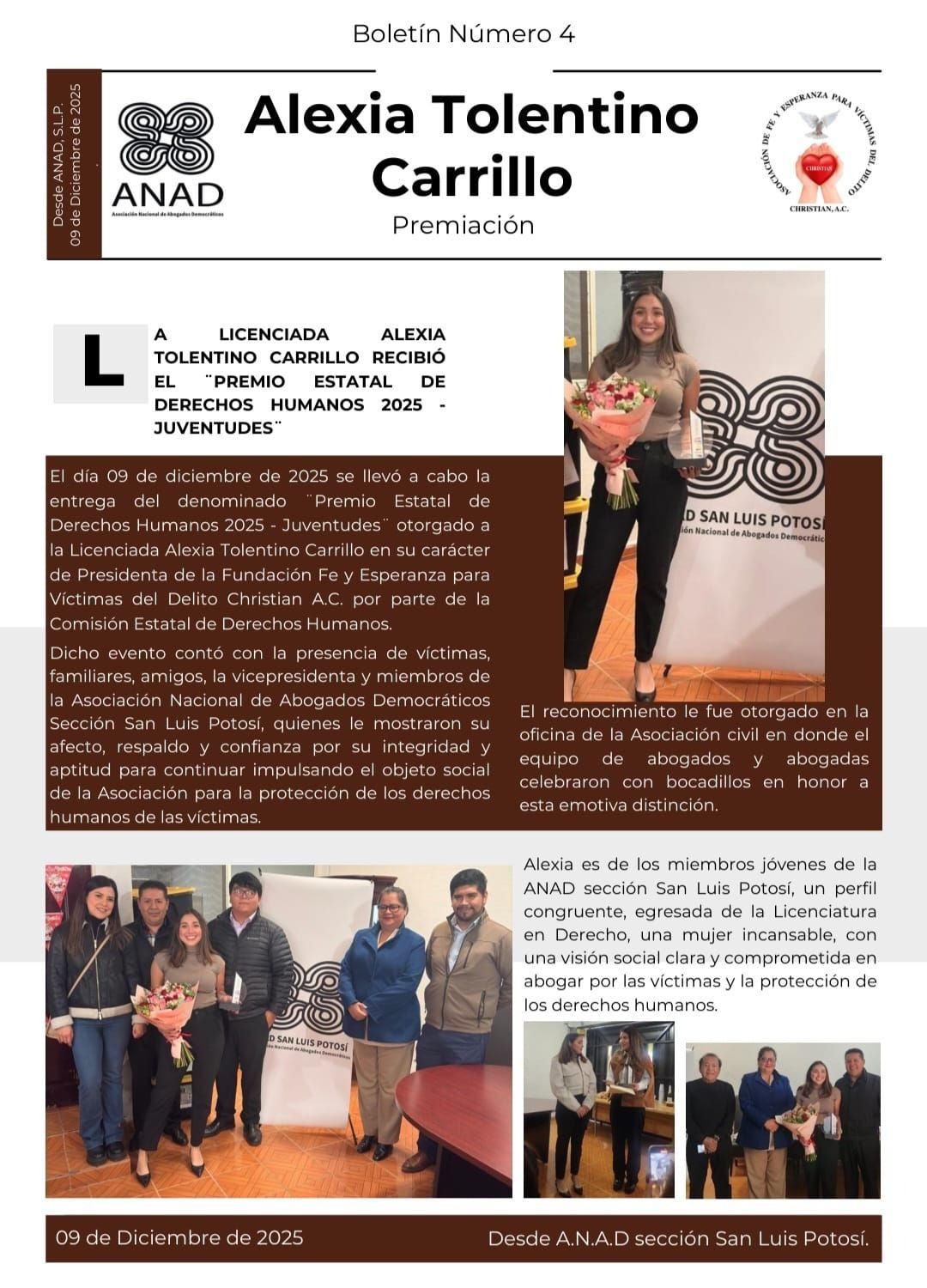 El reconocimiento y los 20 mil pesos del apoyo económico fueron entregados a la licenciada Alexia Tolentino Carrillo, presidenta de la asociación Fe y Esperanza para Víctimas del Delito Christian, el pasado 9 de diciembre. De acuerdo con un boletín informativo de la Asociación Nacional de Abogados Democráticos (ANAD), el premio fue entregado en sus oficinas, en presencia del equipo de abogadas y abogados, víctimas, familiares y amigos de la seleccionada.