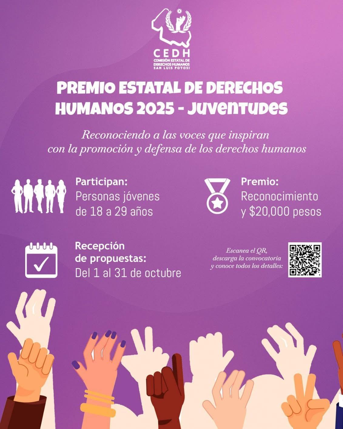 El Premio Estatal de Derechos Humanos de este año estuvo dirigido a reconocer a una persona joven, de entre 18 y 29 años, por su labor en la promoción y defensa de los derechos humanos en San Luis Potosí. La convocatoria se publicó el 8 de octubre en las redes sociales de la Comisión Estatal de Derechos Humanos (CEDH) y establecía que el resultado se haría público a más tardar el 6 de diciembre de 2025 en la página oficial y medios de comunicación. Sin embargo, la fecha pasó inadvertida: ni el resultado ni la ceremonia de entrega fueron públicos.