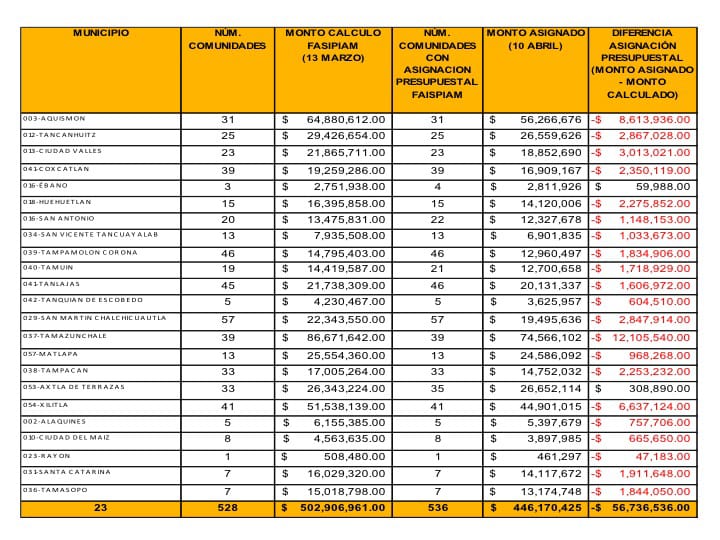 Asimismo, Acatitla, una de las 57 comunidades de San Martín Chalchicuautla con un recorte de 2 millones 847 914 pesos; Coromohon, del municipio Tanlajás, el cual tiene 46 comunidades a las que se les quitó 1 millón 606 mil 972; y Tocoy, San Pedro, Tanjasnec, y Tanchahuil, de las 22 comunidades del municipio de San Antonio, 1 millón 148 mil 153 pesos.