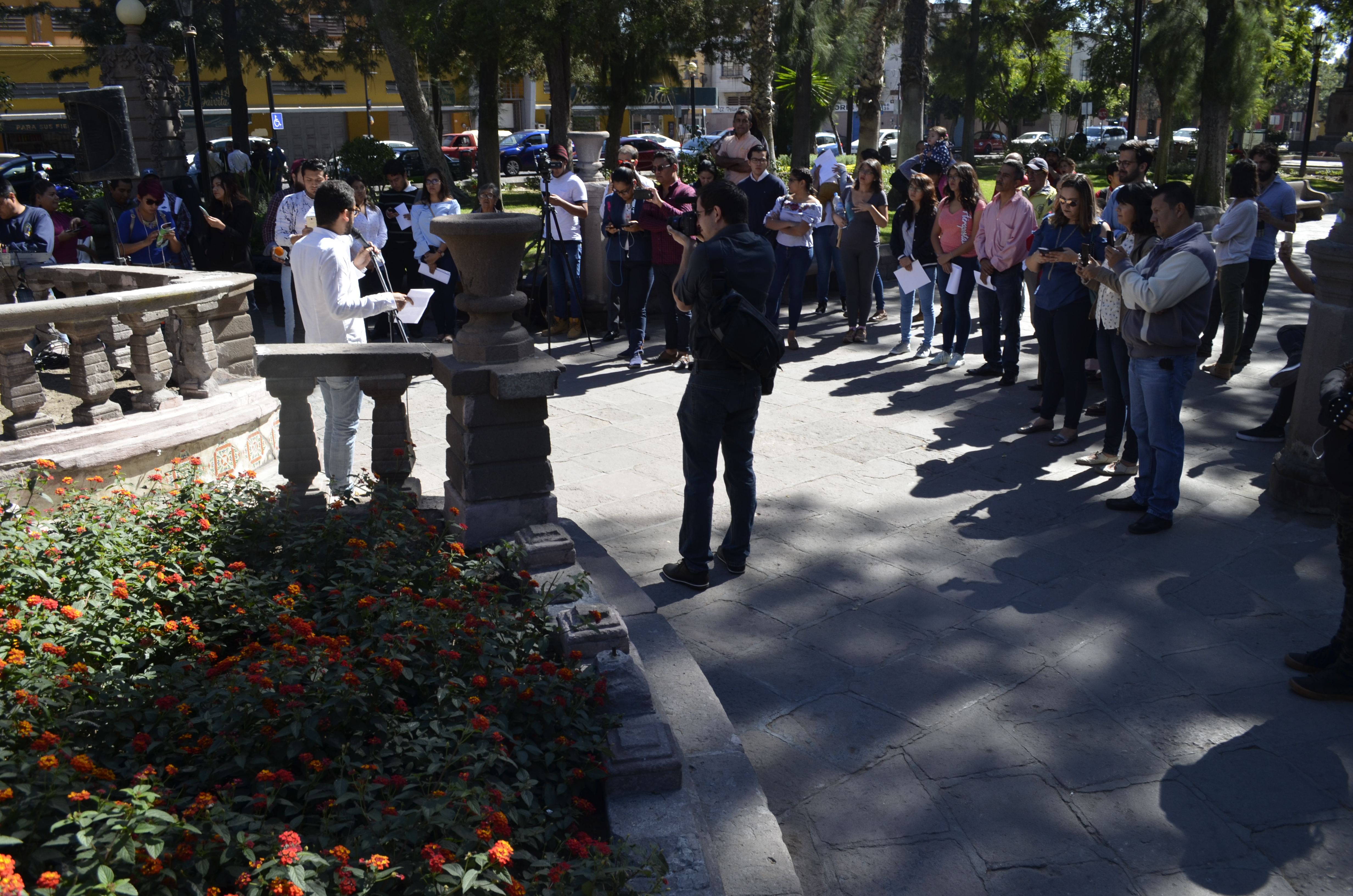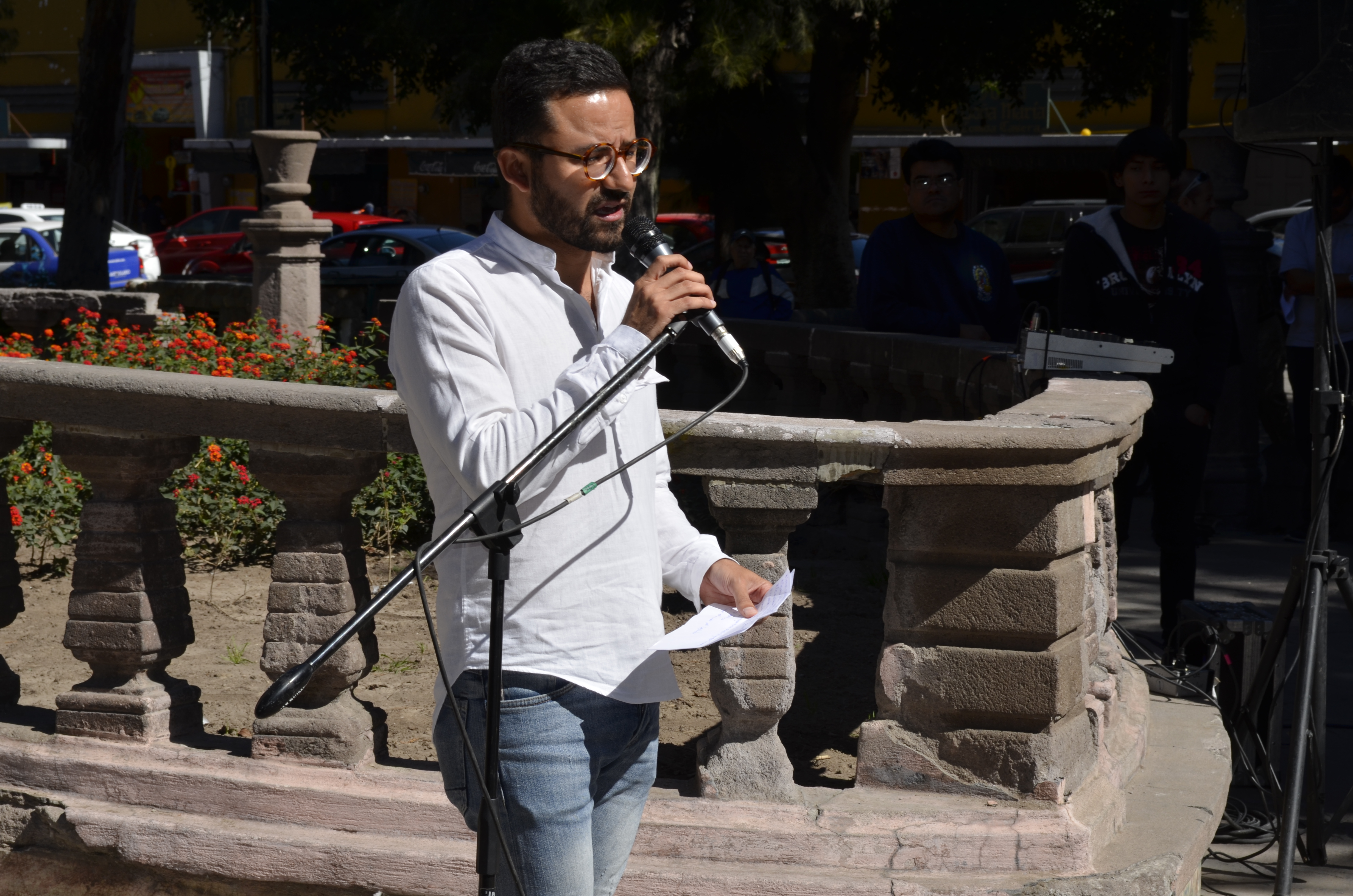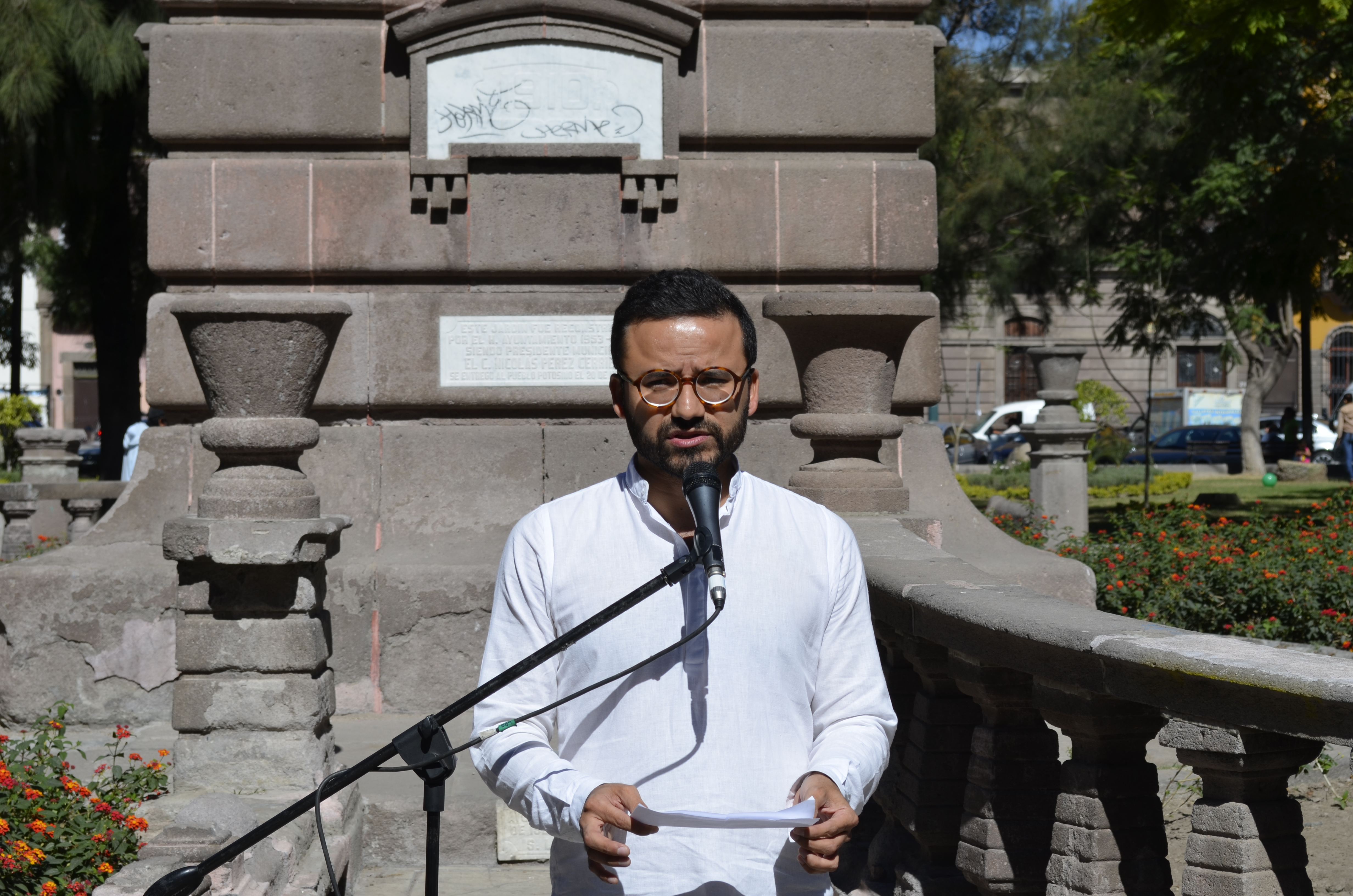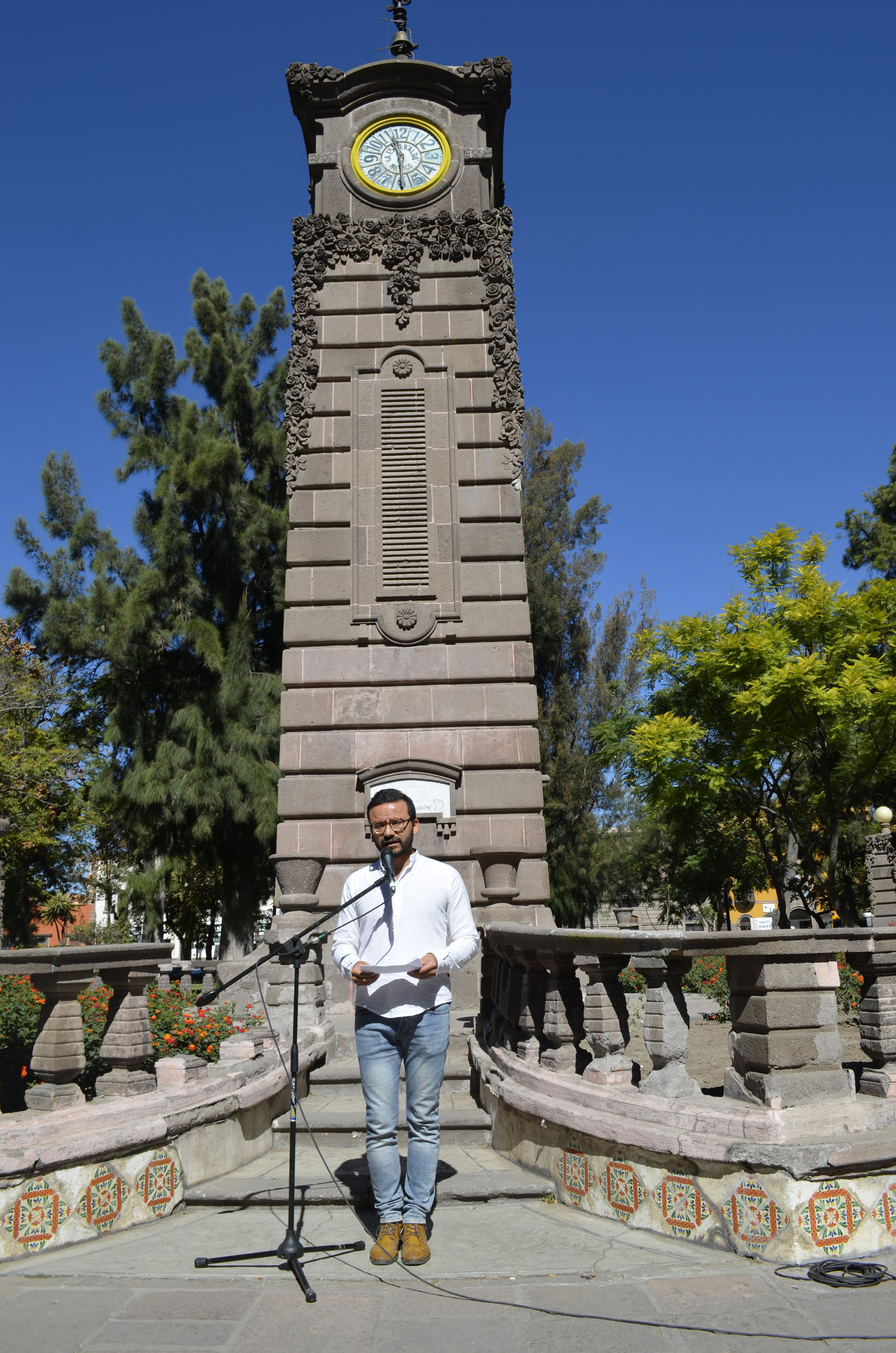 Al pie del vetusto reloj del jardín Colón, Jesús Monsiváis Cerda se presentó como Candidato Independiente a diputado local por el sexto distrito electoral con cabecera en la capital del estado.