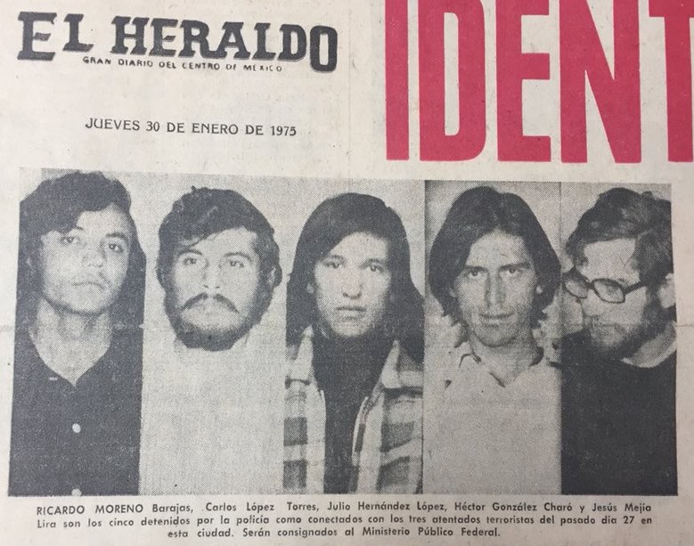 En la imagen aparece con barba y el cabello negro, desordenado, camisa blanca. Mira de forma oblicua a la cámara, con expresión seria, como escudriñando la escena para consumo de la prensa de nota roja de la época. Tiene 34 años. Lo acompañan cuatro jóvenes, estudiantes universitarios: Ricardo Moreno Barajas, Julio Hernández López, Héctor González Charó y Jesús Mejía Lira. No hay sonrisas o dramatización. Comparten miradas directas, contenidas.