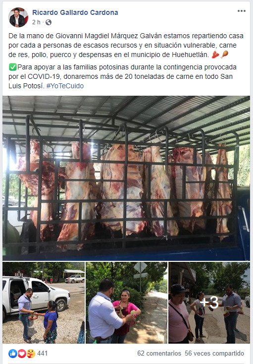 Desde hace unas semanas, el Consejo Estatal Electoral y de Participación Ciudadana (CEEPAC) anunció que ya se habían recibido quejas en contra de actores políticos por la entrega de ayudas sociales durante la coyuntura de la pandemia del Covid-19, no obstante, el reparto prosigue, puesto que el diputado federal, Ricardo Gallardo Cardona inició este lunes la entrega de diez toneladas de carne en el municipio de Huehuetlán.