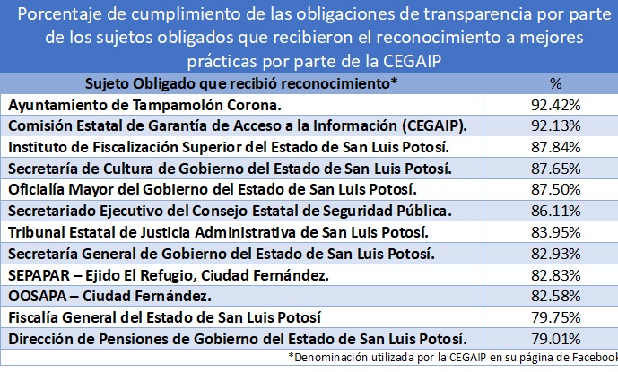 De acuerdo con esa información, la mitad de los sujetos oficiales que recibieron el reconocimiento de mejores prácticas por parte de la CEGAIP estuvieron por debajo del 90 por ciento, que podría considerarse el porcentaje mínimo aprobatorio como en el caso de las obligaciones de transparencia.