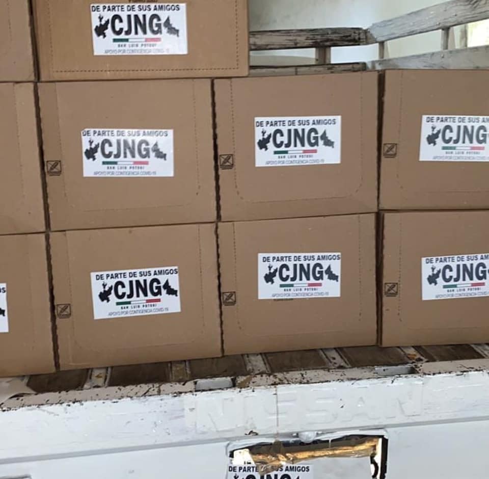 “De parte de sus amigos CJNG San Luis Potosí. Apoyo por contingencia covid 19”, se lee en las etiquetas.