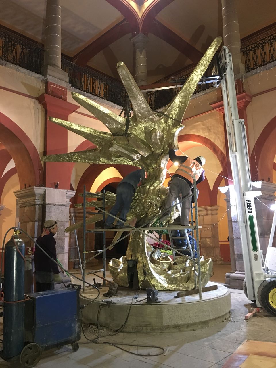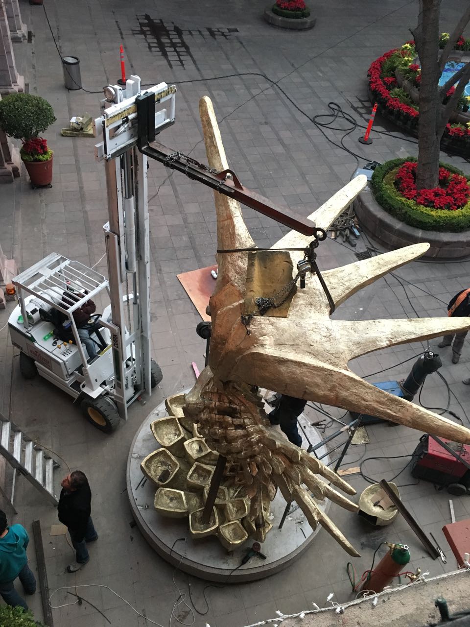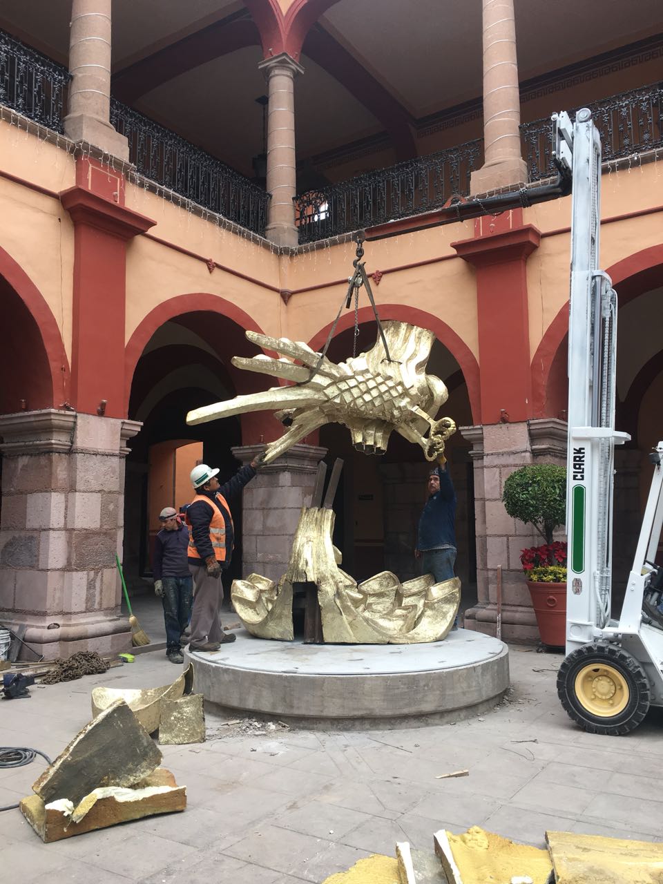 Para colocar el monumento, fue necesario cavar en la parte derecha del fondo del patio a fin de colocar un cimiento y una base de metal en la que fue montada “la figura del águila en vuelo”.