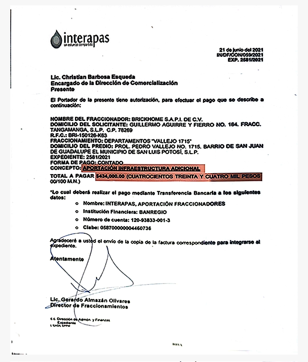Si Interapas puede o no solucionar drenajes colapsados como ese, parece ser una pregunta que se responde con ciertas dimensiones o cantidad de ceros. A una cuadra del domicilio de la familia de Alberto, en la calle Pedro Vallejo frente al Jardín de San Juan de Guadalupe, el Organismo Operador otorgó recientemente una Resolución Aprobatoria Condicionada a la solicitud de la empresa Brickhome S. A. P. I. de C. V. para la Factibilidad de Agua Potable y Drenaje Sanitario para 112 tomas de lo que será el proyecto vertical Barrio Vallejo.