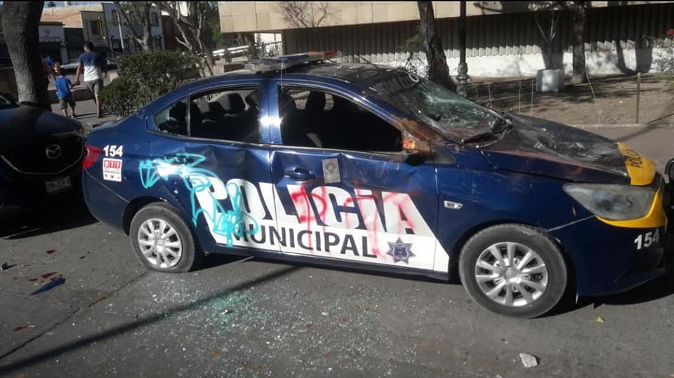 Al pasar frente a la Fiscalía General del Estado, los manifestantes realizaron diversas pintas, lanzaron piedras contra las ventanas de la institución y rompieron la puertas de cristal de la entrada. También, vandalizaron una patrulla de la policía municipal de Soledad de Graciano Sánchez que se encontraba estacionada afuera y le prendieron fuego.