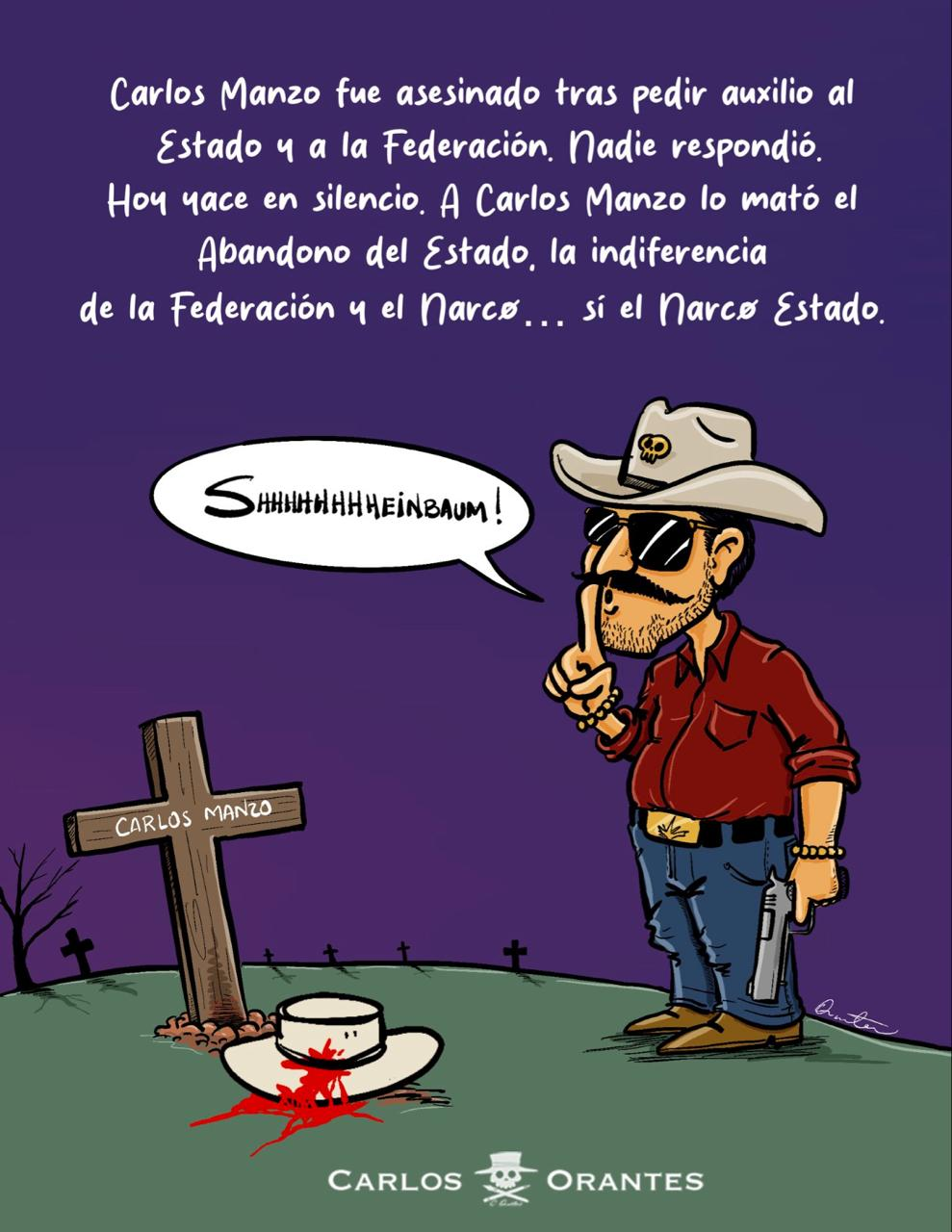 -Cuando el Estado abandona. La pregunta es inevitable: ¿cuántos más deberán morir para que el Estado mexicano reaccione con la fuerza y la dignidad que su pueblo merece? ¿Cuántos funerales de servidores públicos honestos necesita este gobierno para entender que el miedo no puede seguir siendo política de Estado? Carlos Manzo no debe convertirse en una estadística más. Su nombre debe recordarse como el del alcalde que prefirió morir de pie antes que vivir de rodillas como mencionaba Emiliano Zapata. Porque si la valentía sigue costando la vida, entonces la cobardía seguirá gobernando México. El cartón de Carlos Orantes fue uno de los más impactantes sobre el asesinato de Carlos Manzo. El monero lo posteó acompañado del siguiente mensaje: “Cuando el Estado abandona, el crimen gobierna. A Carlos Manzo no lo mataron las balas, lo mató el silencio del poder. Hasta siempre #CarlosManzo Me dueles #México”.