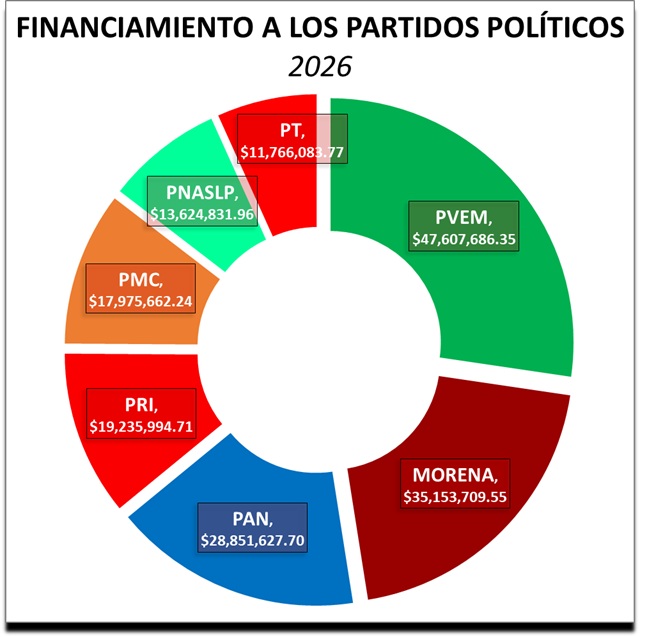 Así, se comienza a diferenciar el monto adicional que se entrega a cada partido: al PVEM $38’654,882.32, a MORENA $26’563,642.70, al PAN $20’445,116.63, al PRI $11’109,550.62, al PMC $9’885,926.87, al PNASLP $5’551,975.14 y al PT $3’857,209.91.