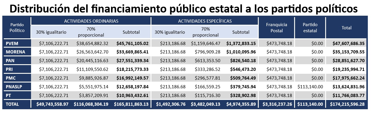 El monto total distribuido a cada partido quedó con $47’607,686.35 para el PVEM, $35’153,709.55 para MORENA, $28’851,627.70 para el PAN, $19’235,994.71 para el PRI, $17’975,662.24 para el PMC, $13’624,831.96 para el PNASLP y $11’766,083.77 para el PT.