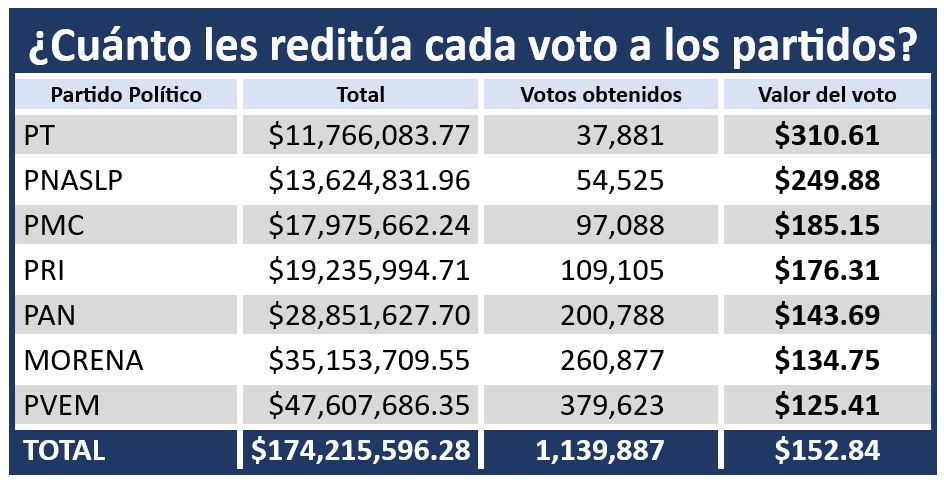 Cada voto le dio 125.41 pesos al PVEM, 134.75 pesos a MORENA, 143.69 pesos al PAN, 176.31 pesos al PRI, 185.15 pesos al PMC, 249.88 pesos al PNALSLP y 310.61 al PT.