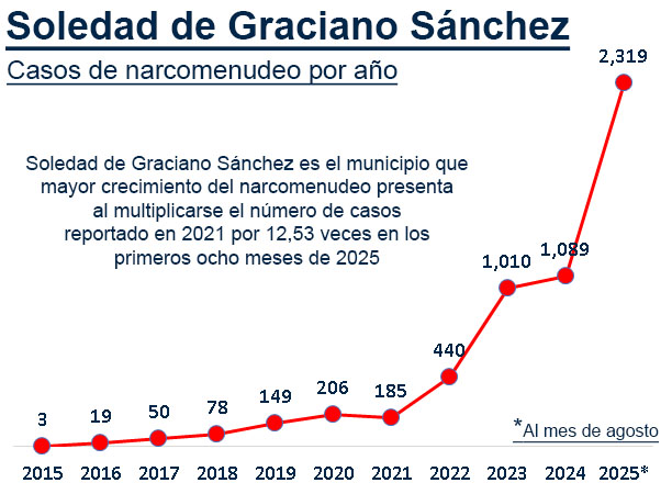 Soledad de Graciano Sánchez es el municipio que mayor crecimiento del narcomenudeo presenta al multiplicarse el número de casos reportado en 2021 (185) por 12,53 veces al llegar de enero a agosto de este año a 2 mil 319.