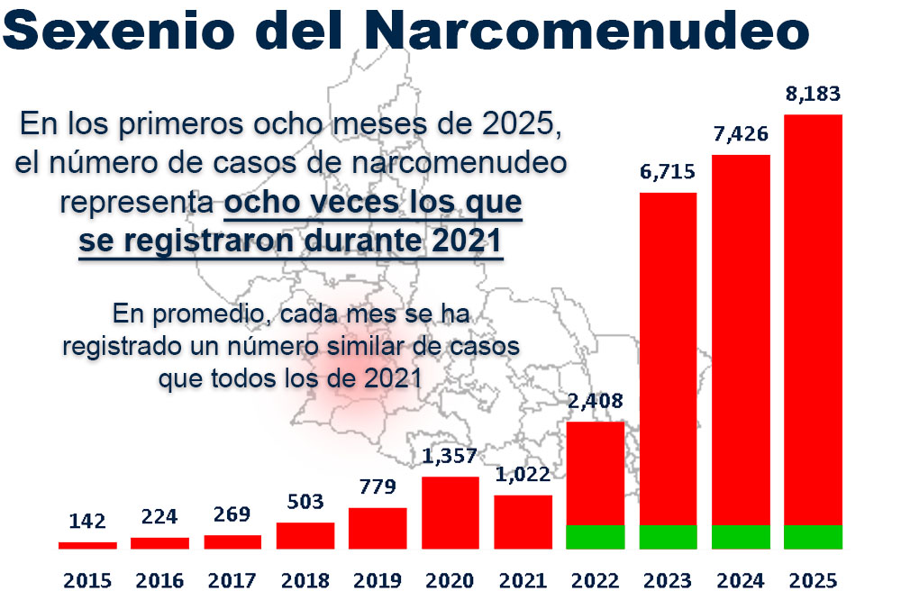 Tan solo en estos ocho meses de 2025, el número de casos de narcomenudeo representa ocho veces los que se registraron durante 2021. Más alarmante: el número de casos de narcomenudeo de los primeros ocho meses de este año (8 mil 183) casi duplica a los ocurridos durante todo el sexenio pasado (4 mil 296).