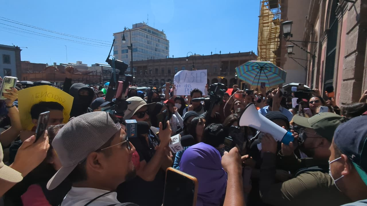 Dos hombres, ambos con el rostro cubierto, tomaron el megáfono y comenzaron a hablar en nombre del movimiento. Uno de ellos, con cubrebocas verde y gorra del mismo tono militar, fue quien insistió en cambiar el eje de la protesta: exigió la destitución del rector. Dijo que la Universidad “vivía del dinero del gobernador Ricardo Gallardo Cardona” y amenazó con cerrar la Zona Industrial para que el mandatario “hiciera caso”.