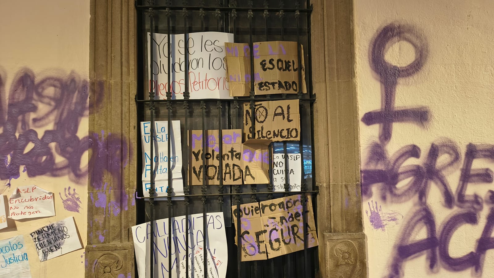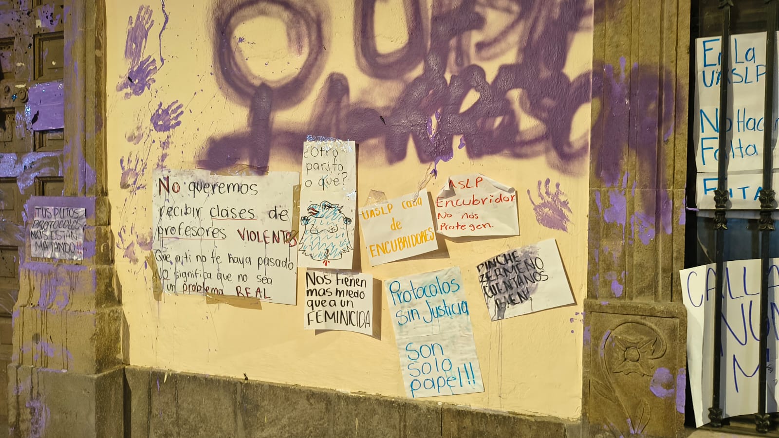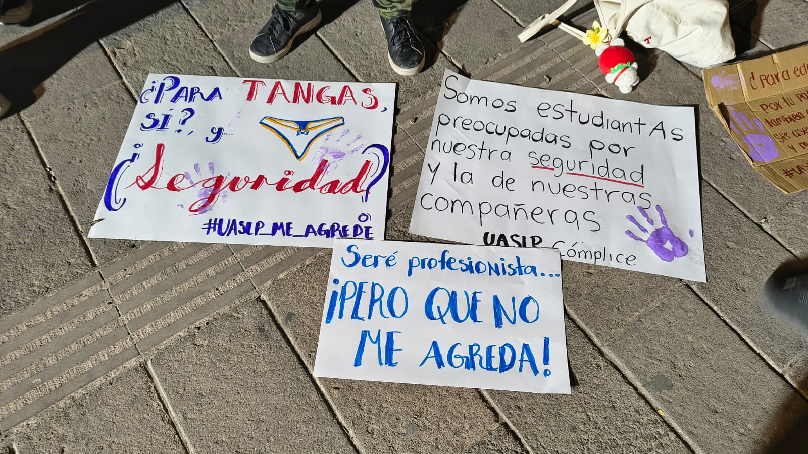 Durante la concentración, comenzaron a colocarse pancartas dirigidas a las autoridades universitarias, encabezadas por el rector Alejandro Zermeño Guerra. Entre las consignas que pudieron leerse se encontraban: “Somos estudiantes preocupadas por nuestra seguridad y la de nuestras compañeras. La UASLP cómplice”, “Máxima casa de abusadores!”, “Los protocolos sólo ayudan a los agresores” y “Quiero estudiar sin miedo”.