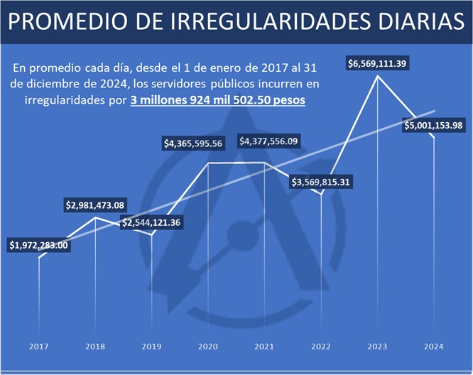 Aunque se trata de ocho ejercicios fiscales, la cifra no resulta menor si se toma en cuenta que representa que en promedio cada día, desde el 1 de enero de 2017 al 31 de diciembre de 2024, los servidores públicos incurren en irregularidades por 3 millones 924 mil 502.50 pesos.