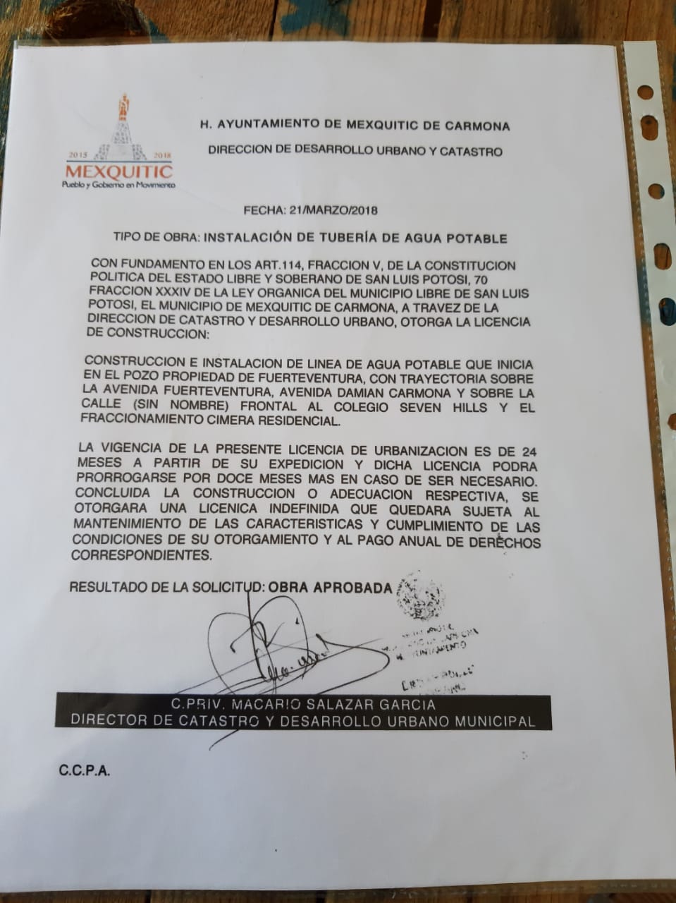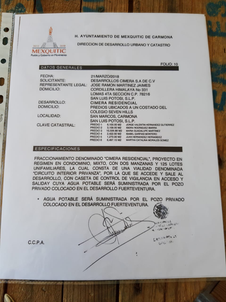 En dicho permiso se especifica que se conectará un pozo privado de agua potable perteneciente al Desarrollo Fuerte Ventura; la línea de tuberías recorrerá las avenidas Fuerte Ventura y Damián Carmona, hasta pasar frente al colegio Seven Hills y llegar a su destino en el Fraccionamiento Cimera Residencial. Toda vez que, según los comuneros de San Marcos Carmona y sus abogadas, el Interapas aseguró nunca haber aprobado la factibilidad de ningún proyecto de esta índole.