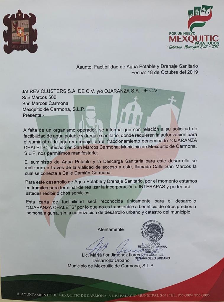 En otro documento expedido por el Ayuntamiento de Mexquitic de Carmona, reconocen que se encuentran en trámites para incorporarse a Interapas y poder recibir el suministro de agua y la descarga sanitaria del fraccionamiento conocido como Ojaranza Chalets.