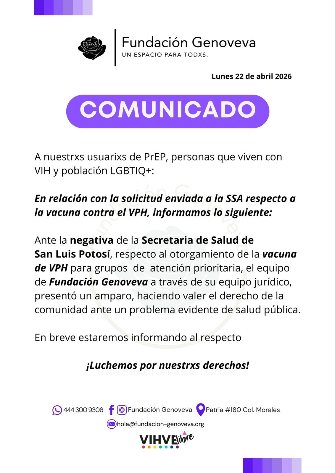 El doctor Miguel Waldo Izquierdo, presidente de la Fundación Genoveva, informó en entrevista que la organización interpuso un amparo tras la negativa de la Secretaría de Salud de San Luis Potosí a otorgar la vacuna contra el Virus del Papiloma Humano (VPH) a poblaciones consideradas de atención prioritaria.
