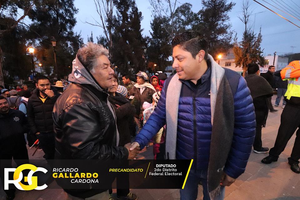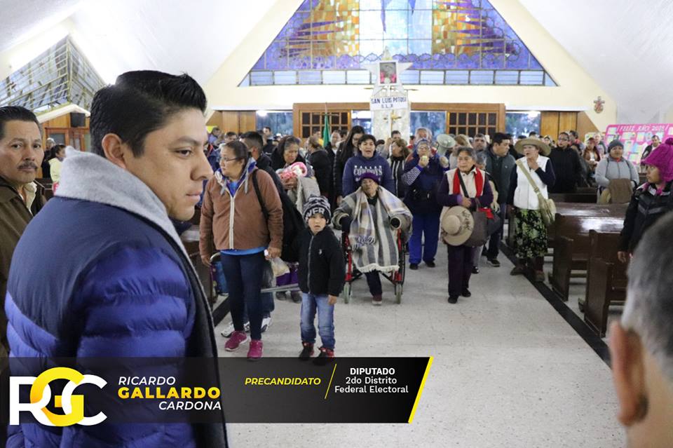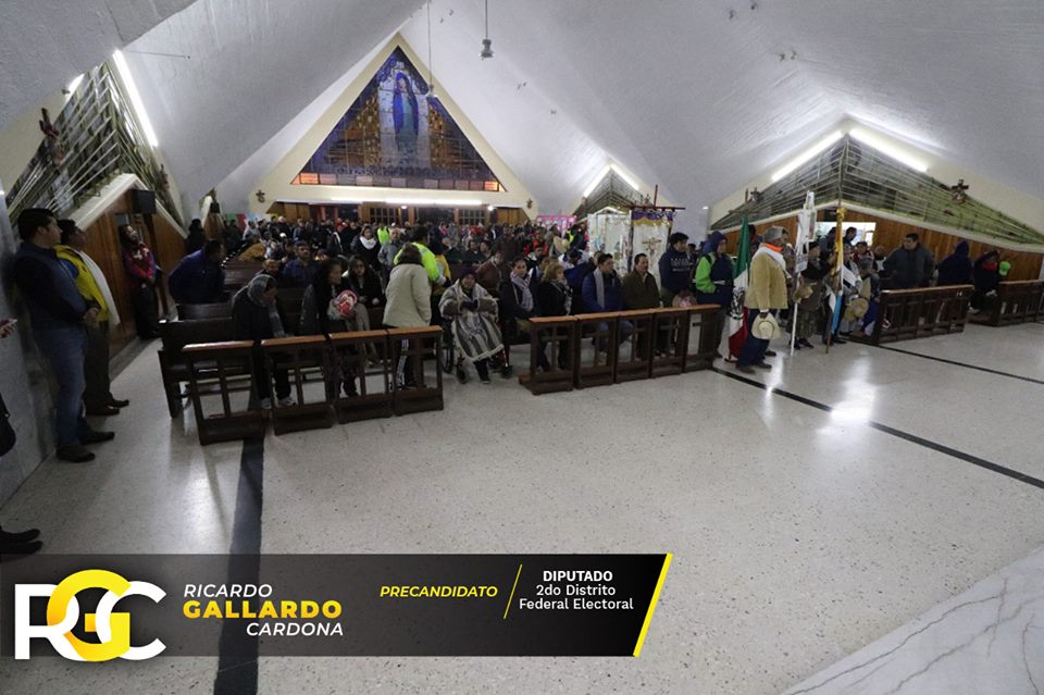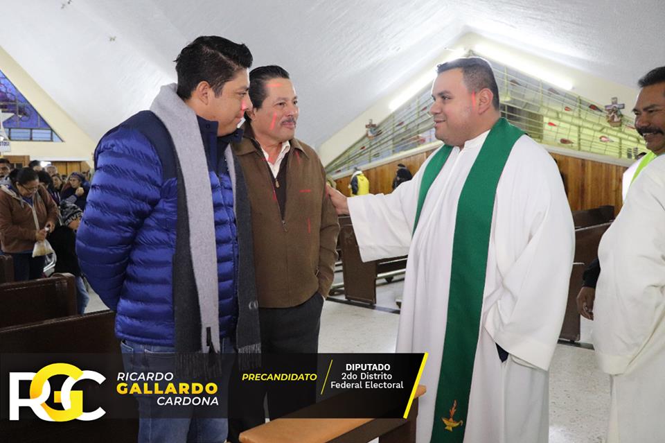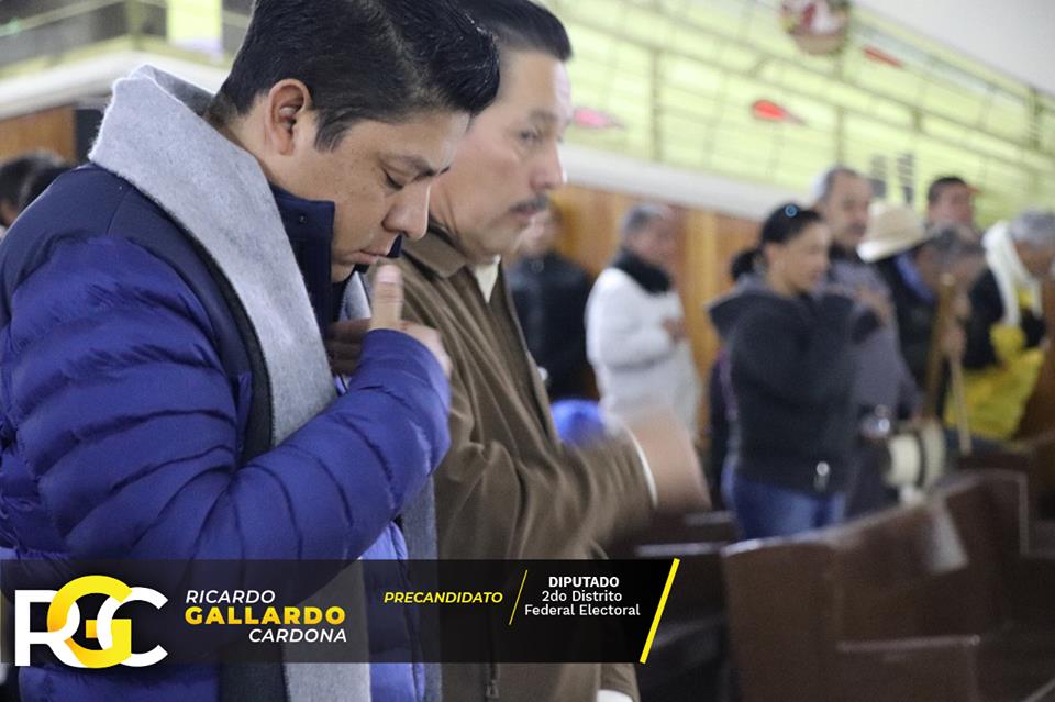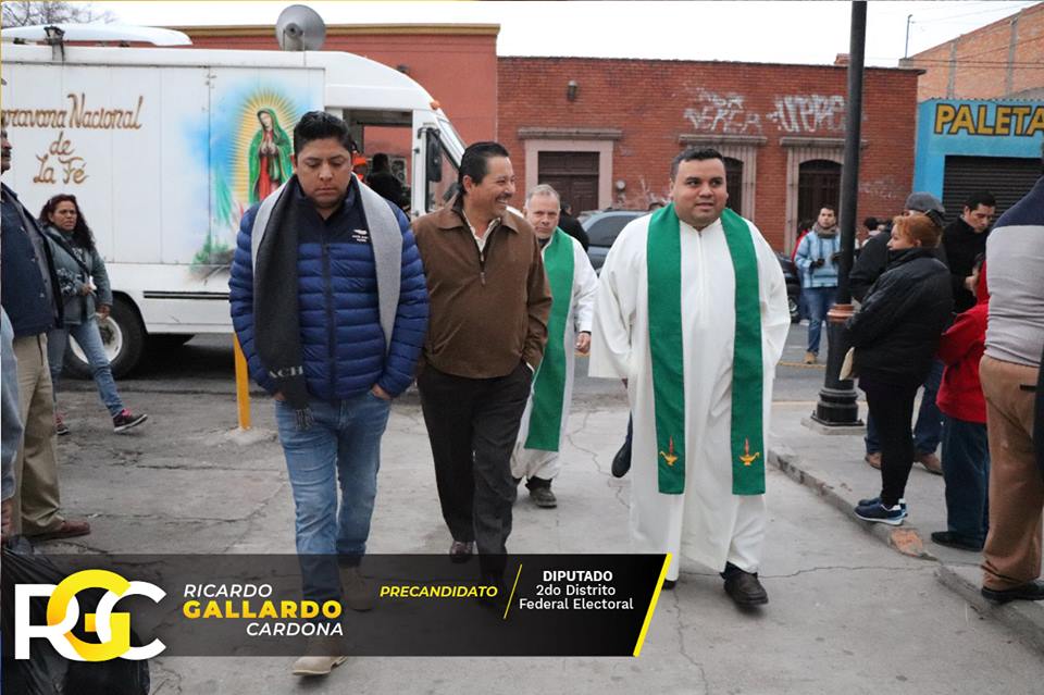Este martes el precandidato del Partido de la Revolución Democrática a diputado federal por el Distrito 02, José Ricardo Gallardo Cardona, presumió y publicó en su cuenta de Facebook fotos de su presencia en la parroquia Nuestra Señora de los Dolores, donde esta mañana fue oficiada la misa con motivo de la partida de peregrinos a San Juan de los Lagos.