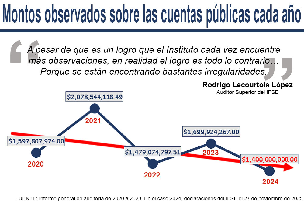 “A pesar de que es un logro que el Instituto cada vez encuentre más observaciones, en realidad el logro es todo lo contrario… Porque se están encontrando bastantes irregularidades. La mayoría de estas irregularidades son en los municipios”, dijo Lecourtois López con clara intención de impresionar con la cifra de mil 400 millones de pesos.
