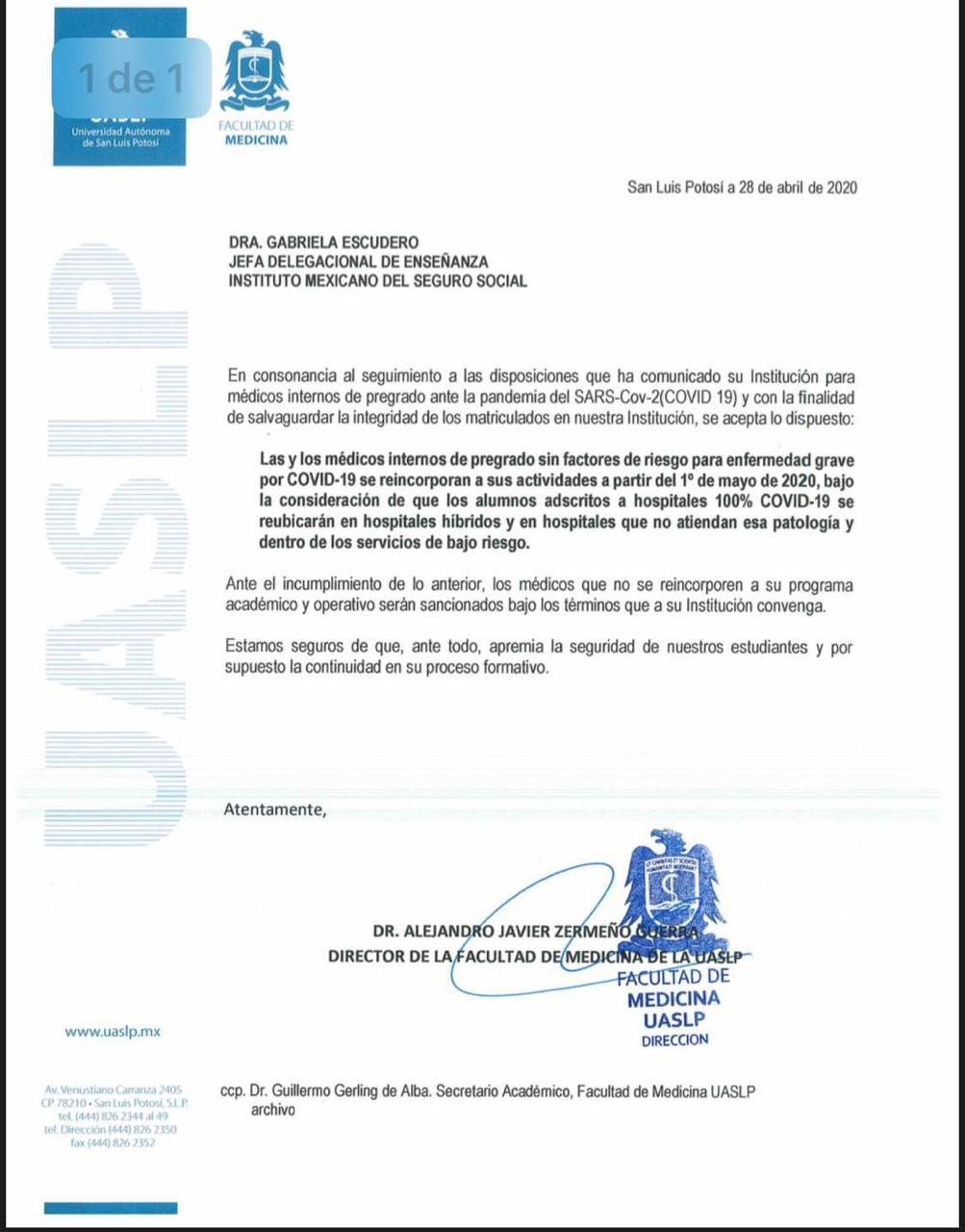 Los internos de pregrado proporcionaron copia del oficio en el que, todavía en su carácter de director de la Facultad de Medicina, Zermeño Guerra comunica a Gabriela Escudero, jefa Delegacional de Enseñanza del IMSS su aceptación para el regreso de los estudiantes en las condiciones propuestas y con la advertencia de sancionar a quien no regrese.