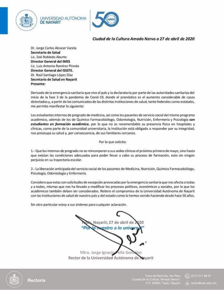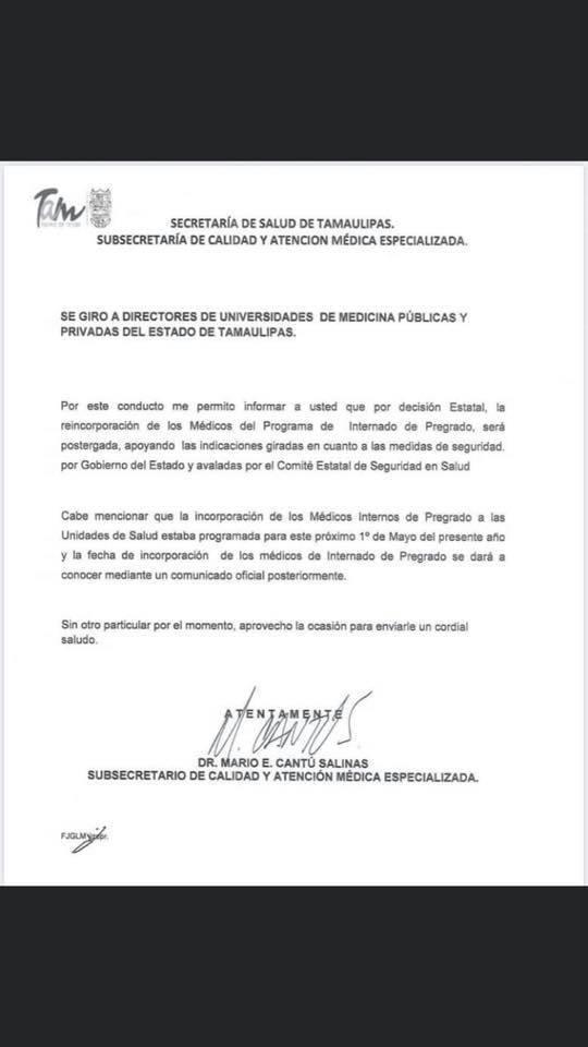 También incluyeron un documento de la Subsecretaría de Calidad y Atención Médica de la Secretaría de Salud de Tamaulipas en el que comunican a la universidades de de ese estado que postergan la reincorporación de los internos de pregrado, a pesar de tenerla prevista para el 1º de mayo.