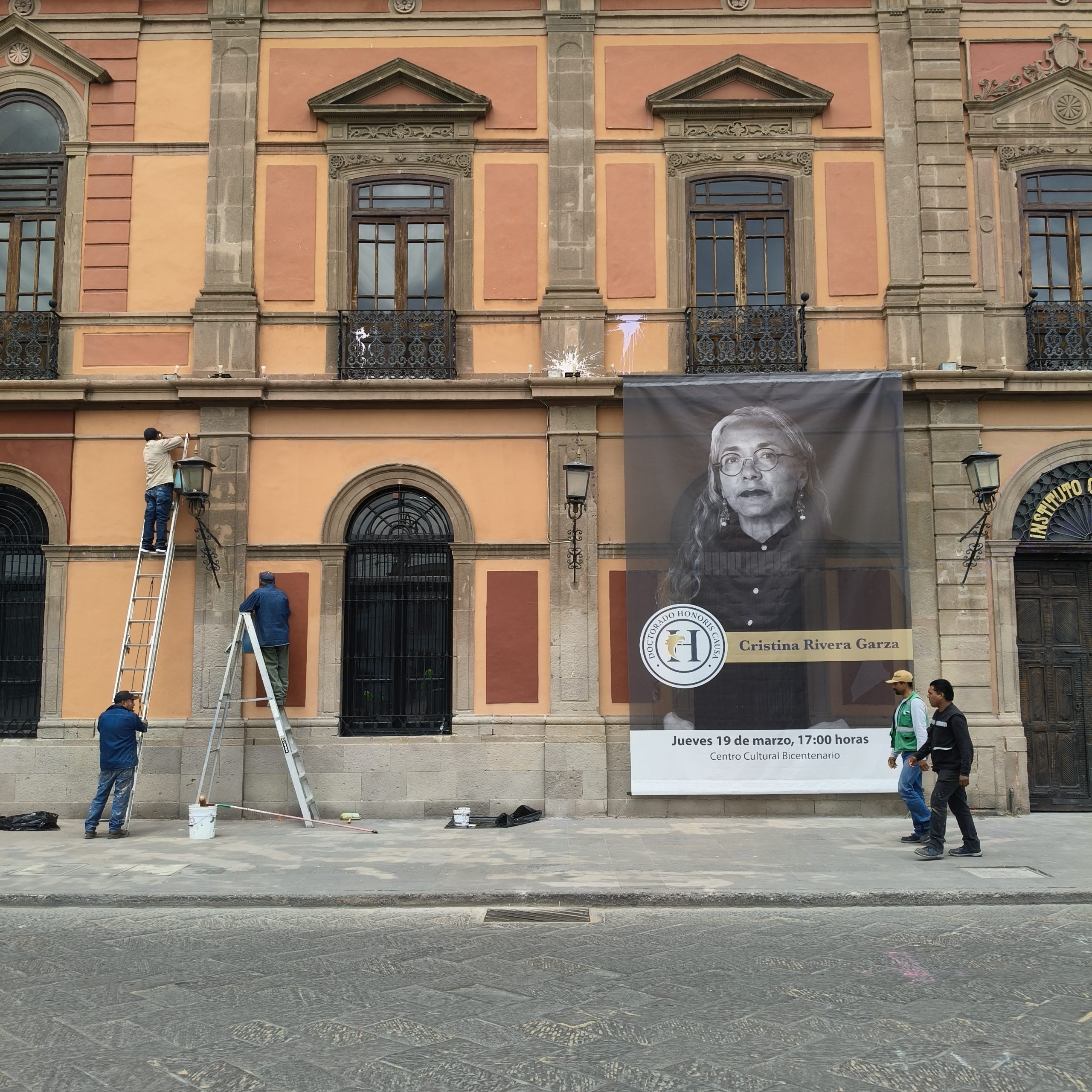 Pocos días antes de que Cristina regrese al origen, a la ciudad cerca del origen, la marcha del 8 de marzo continúa gritando en la fachada del Edificio Central de la Universidad Autónoma de San Luis Potosí, donde se anuncia, al mismo tiempo, la sesión solemne en la que recibirá el Doctorado Honoris Causa. Al mismo tiempo, unos hombres se afanan en borrar la protesta. Cristina mira de frente con esos ojos acuciosos; sus pómulos, su color de piel y su melena revelan, en efecto, su parentesco con los pueblos nómadas que habitaron el Altiplano potosino; su postura probablemente, sea en sí misma un mensaje: Falta Liliana, falta Karla, faltan Itzel, Dulce, Elionai, falta Daniela y muchas otras mujeres más. Esa deuda y esas historias, son otras conexiones profundas de Cristina Rivera Garza con San Luis Potosí.