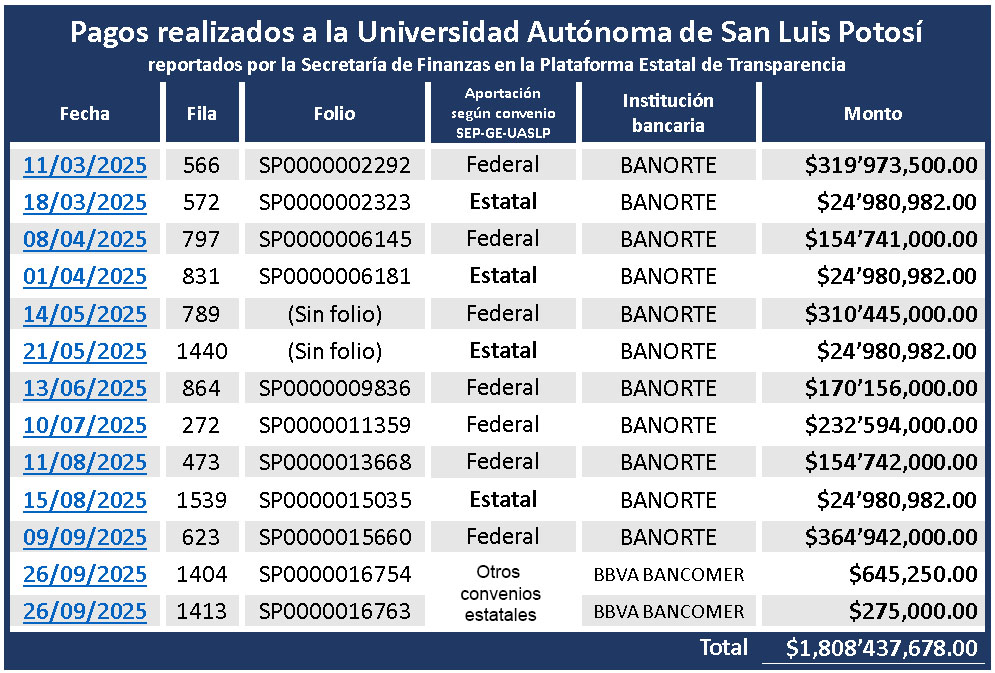 El opaco se vuelve entonces víctima de su propia opacidad. En la relación de egresos que por ley debe publicar la Secretaría de Finanzas en la Plataforma Estatal de Transparencia (PET), de enero a septiembre sólo aparecen once pagos a la UASLP relacionados con el anexo de ejecución, cuando tendrían que aparecer 18.