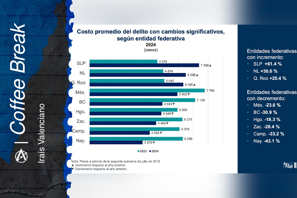 Un indicador que no deja bien parado al estado potosino, es el costo promedio del delito, en cuyo caso, San Luis Potosí ocupa el quinto lugar nacional, con 7 mil 388 pesos por persona afectada durante 2024, solo debajo de Jalisco (9 mil 100 pesos), Puebla, Baja California Sur y Michoacán.