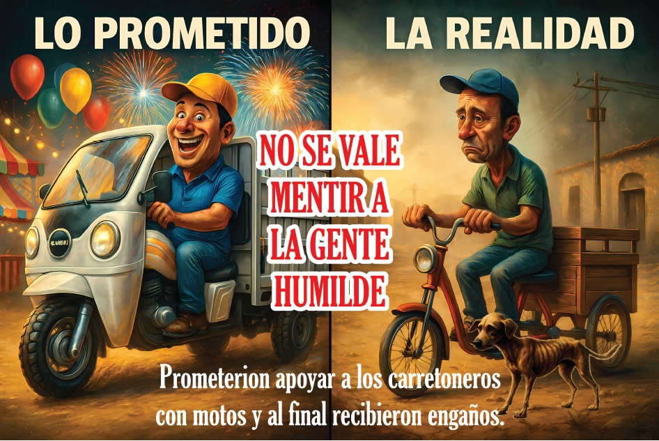 La indignación de los carretoneros los ha llevado a circular entre ellos un meme en el que presentan imágenes sobre lo que consideran “lo prometido” y “la realidad”. “No se vale mentir a la gente humilde. Prometieron apoyar a los carretoneros con motos y al final recibieron engaños”, se señala en la imagen.
