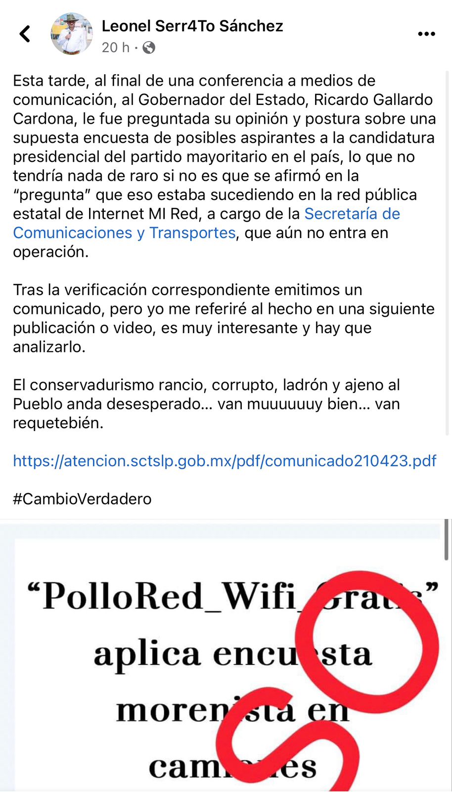El comunicado para deslindar a la Secretaría de Comunicaciones y Transporte girado por Leonel Serrato Sánchez fue publicado después de cuestionar al gobernador Ricardo Gallardo Cardona, quien afirmó que todos los trabajadores de la SCT debían presentar su renuncia por la aparición de encuestas electorales al conectarse a la red Wifi gratuita del transporte público.