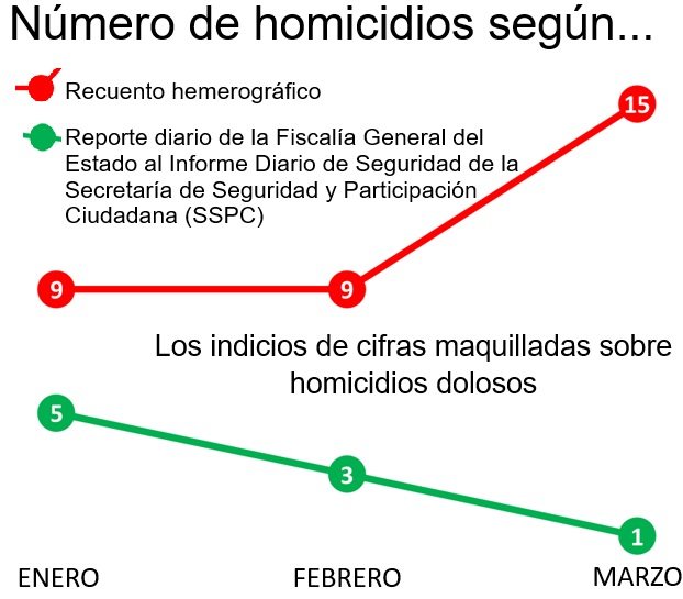 De ser así, el número de homicidios en enero bajaría de nueve a ocho, aún lejos de los cinco reportados y en el caso de marzo en lugar de haber reportado un solo homicidio se habrían tenido que reportar 11.