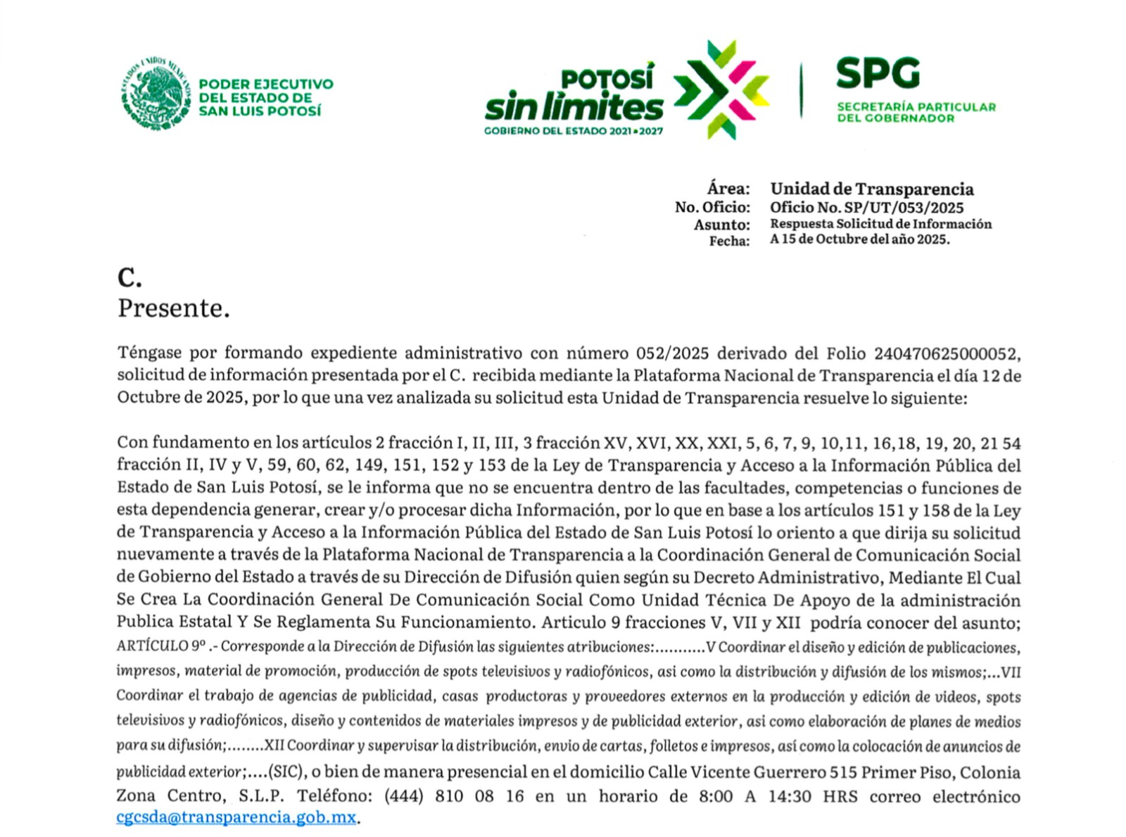 El 15 de octubre, a través del oficio SP/UT/053/2025, la Secretaría Particular del Gobernador respondió que “no se encuentra dentro de las facultades, competencias o funciones de esta dependencia generar, crear y/o procesar dicha información”, y recomendó dirigirse a la Coordinación General de Comunicación Social para que esa instancia entregara los datos solicitados.