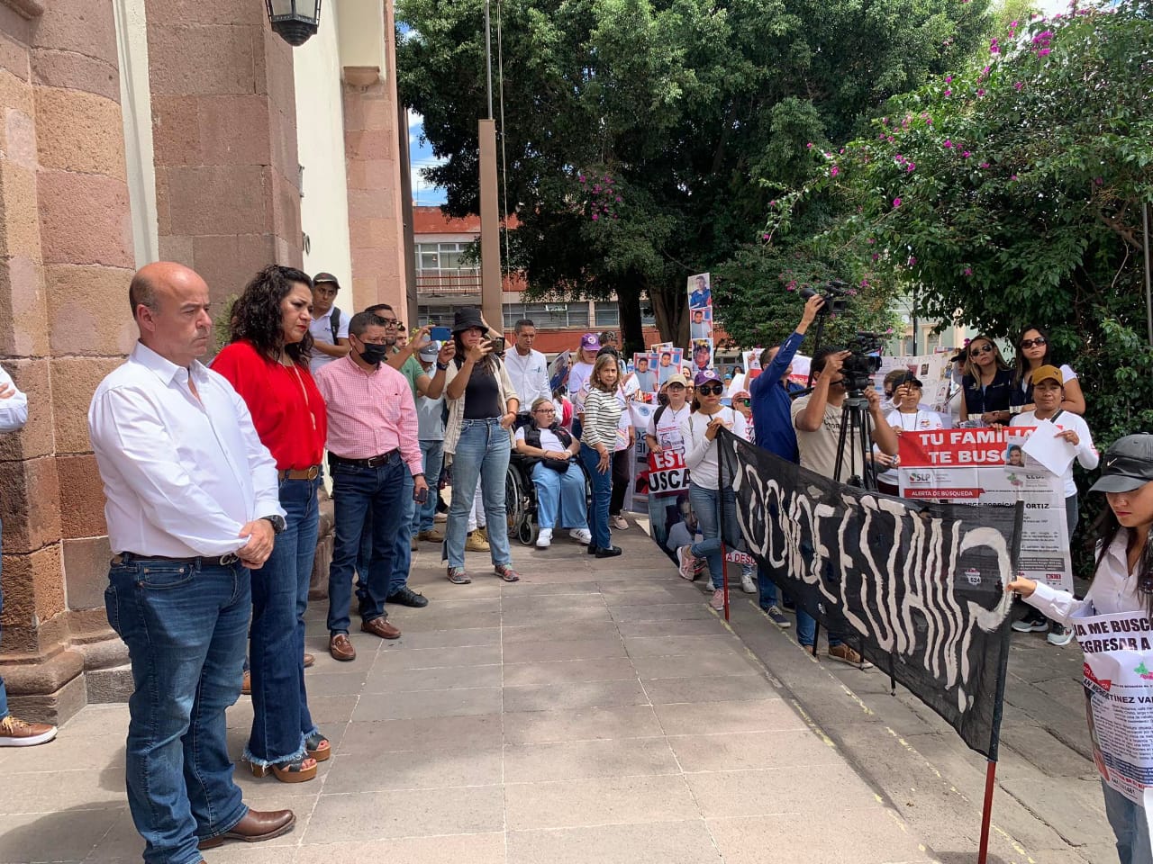 El diputado José Luis Fernández Martínez y la diputada Emma Idalia Saldaña Guerrero estuvieron presentes para escuchar las exigencias de Pérez Rodríguez, Guadalupe Mendiola y de las madres buscadoras encargadas de realizar las prospecciones de búsqueda en fosas clandestinas en el estado.
