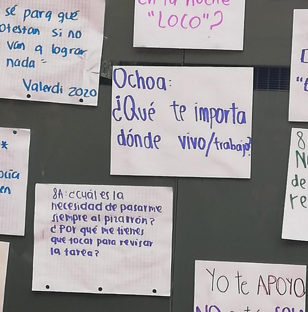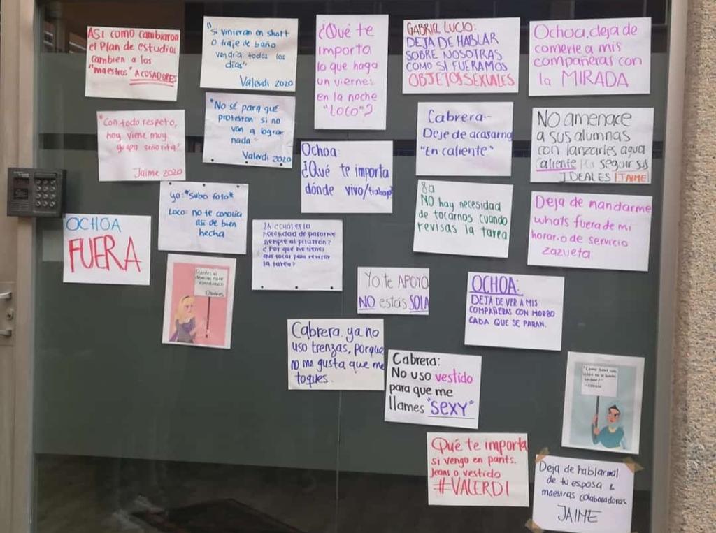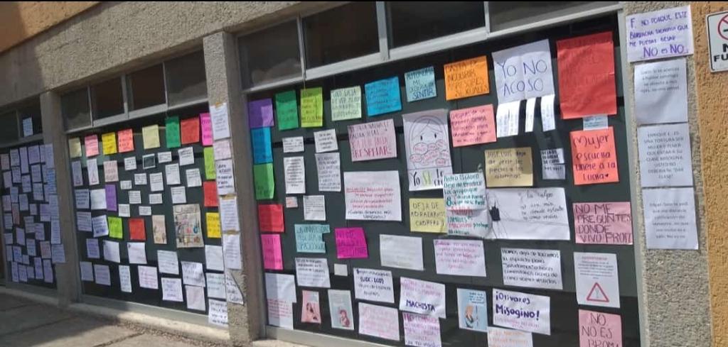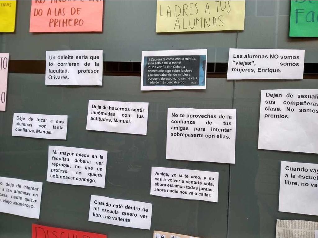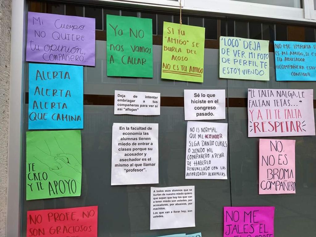 “No es normal que mi acosador siga dando clases o siendo mi compañero a pesar de haberlo denunciado con las autoridades académicas”, es una de las leyendas que destacan en los muros.