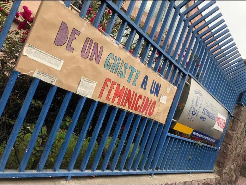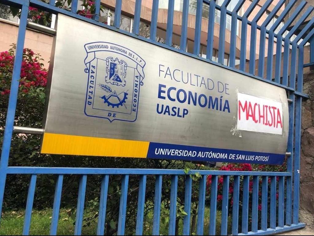 Esta mañana, estudiantes de la Facultad de Economía de la UASLP colocaron en el letrero de acceso al plantel un cartel que califica esa escuela como “machista”, en tanto que muros del interior se convirtieron en una gran pizarra de denuncias y protestas por el acoso sexual que padecen por parte de maestros y compañeros.