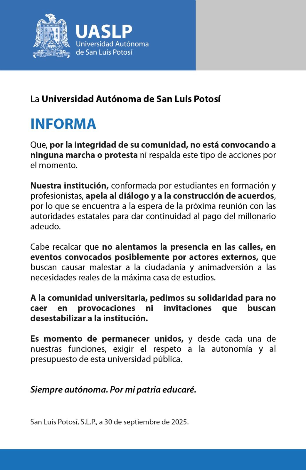 “Cabe recalcar que no alentamos la presencia en las calles, en eventos convocados posiblemente por actores externos, que buscan causar malestar a la ciudadanía y animadversión a las necesidades reales de la máxima casa de estudios”, señaló el comunicado de la UASLP.