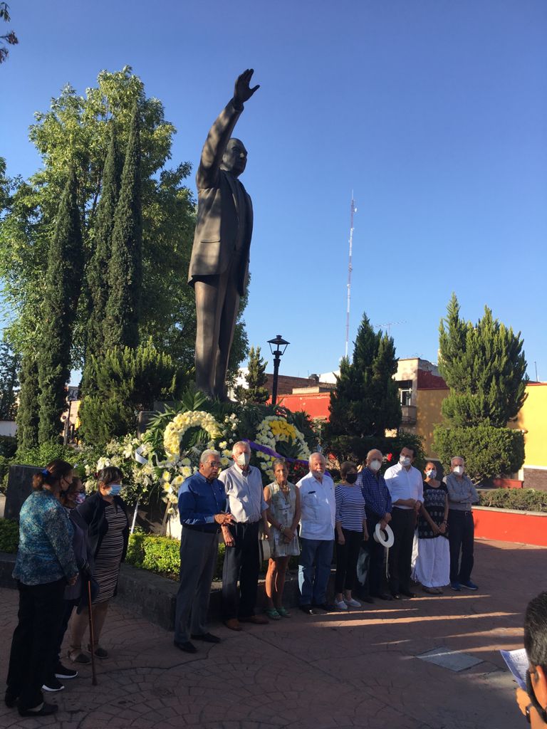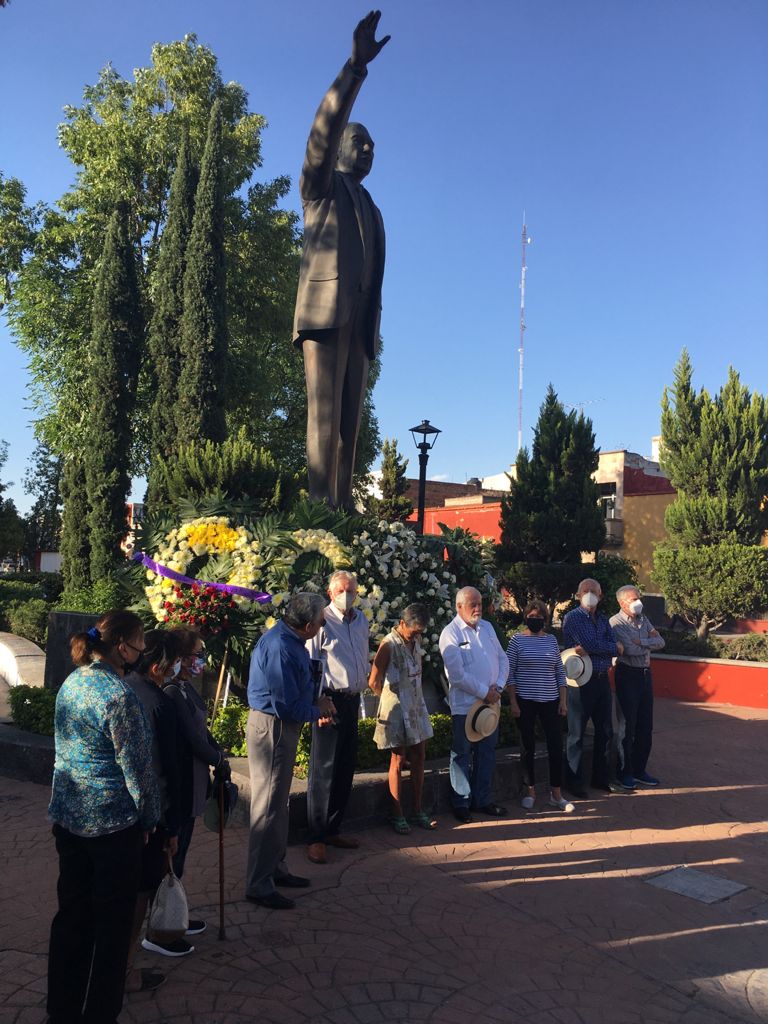 Xavier Nava Palacios, candidato de Morena a la reelección como alcalde de San Luis Potosí, se incorporó al acto momentos después de que habían colocado la ofrenda floral ante el monumento al Doctor Nava.