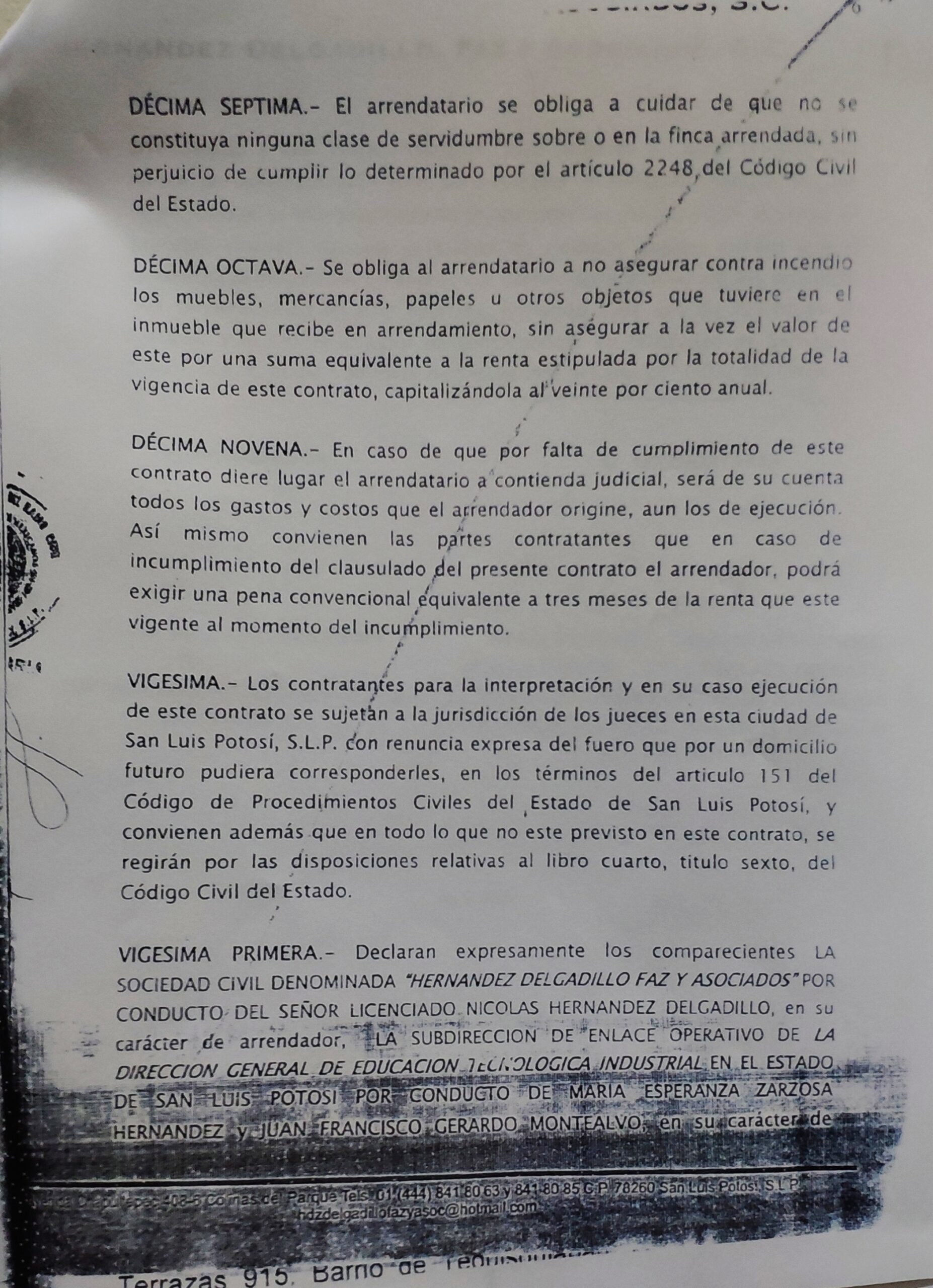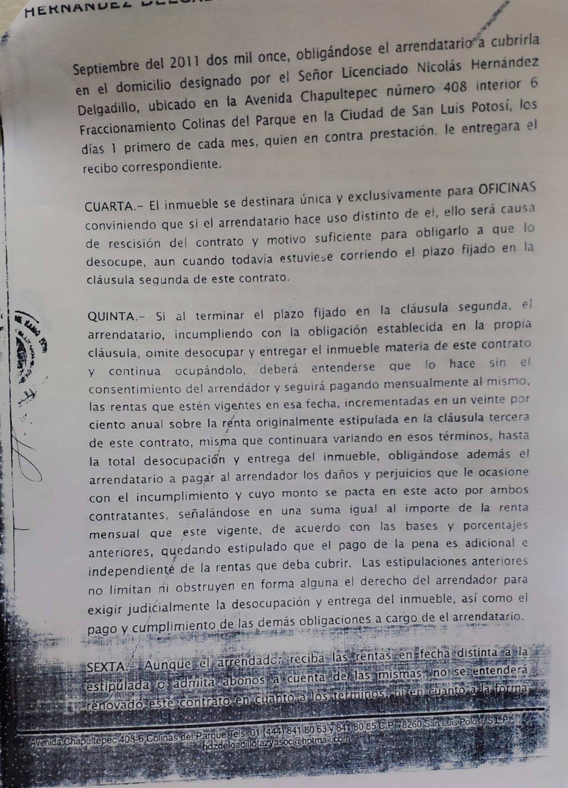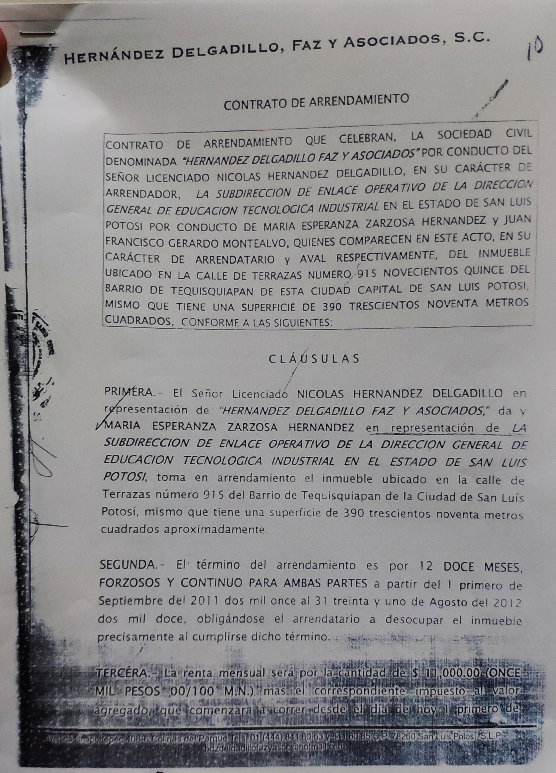 En el contrato de arrendamiento del inmueble que se ubica en Alfredo M. Terrazas número 915 no se menciona ni figura el propietario; en su lugar, aparece la sociedad “Hernández Degaldillo, Faz y asociados S.C.” representada por Nicolás Hernández Delgadillo.