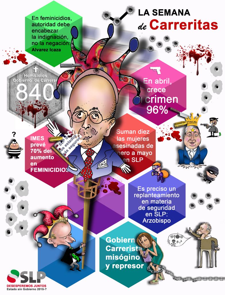 En una de las figuras geométricas aparece la caricatura de Carreras López, quien sostiene una especie de mástil en el que se puede ver en la parte alta a Renato Sales Heredia, comisionado Nacional de Seguridad, quien lleva en el bolsillo un banderín lleno de perforaciones de bala con el letrero “SLP de los estados más seguros”.