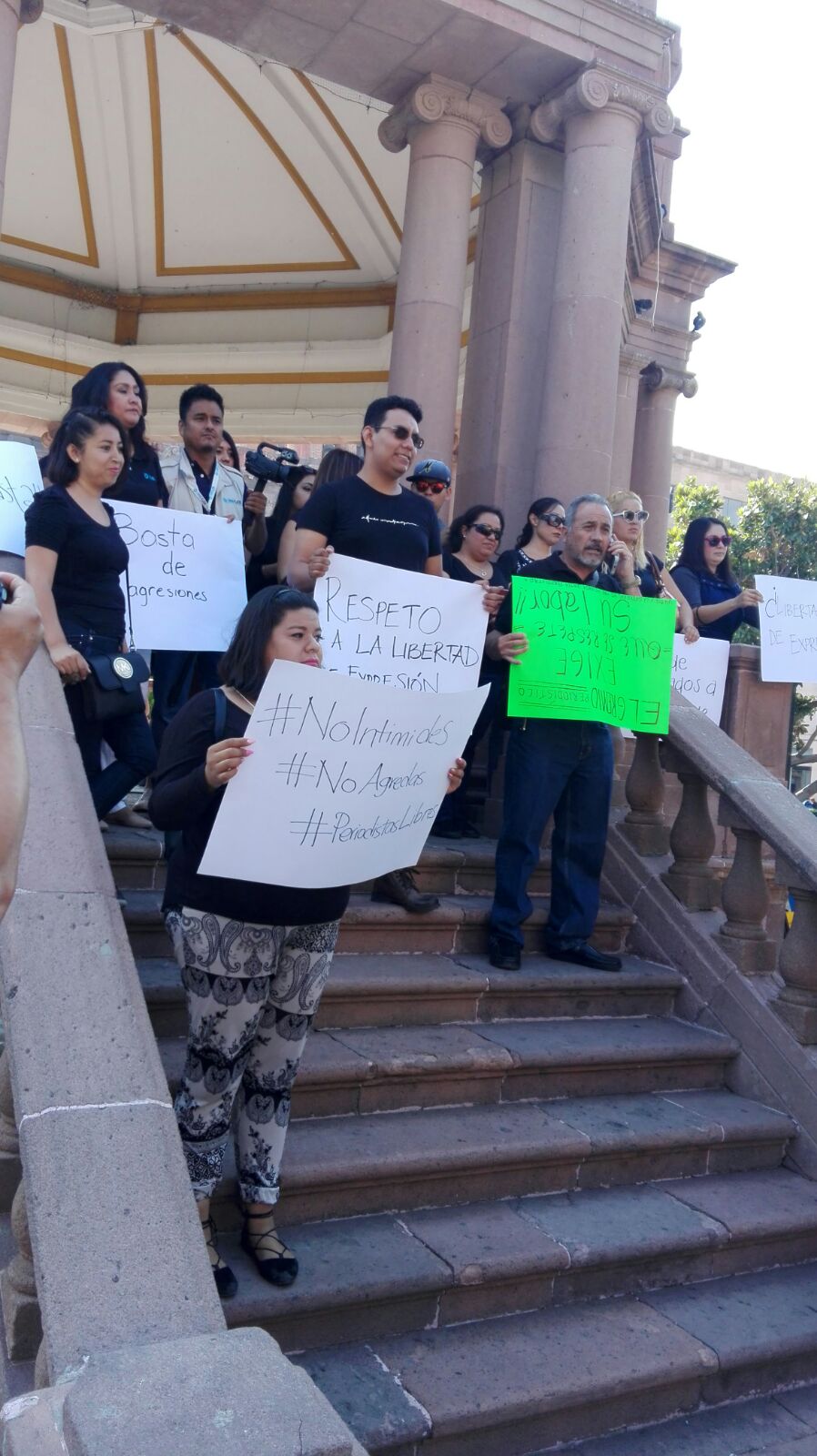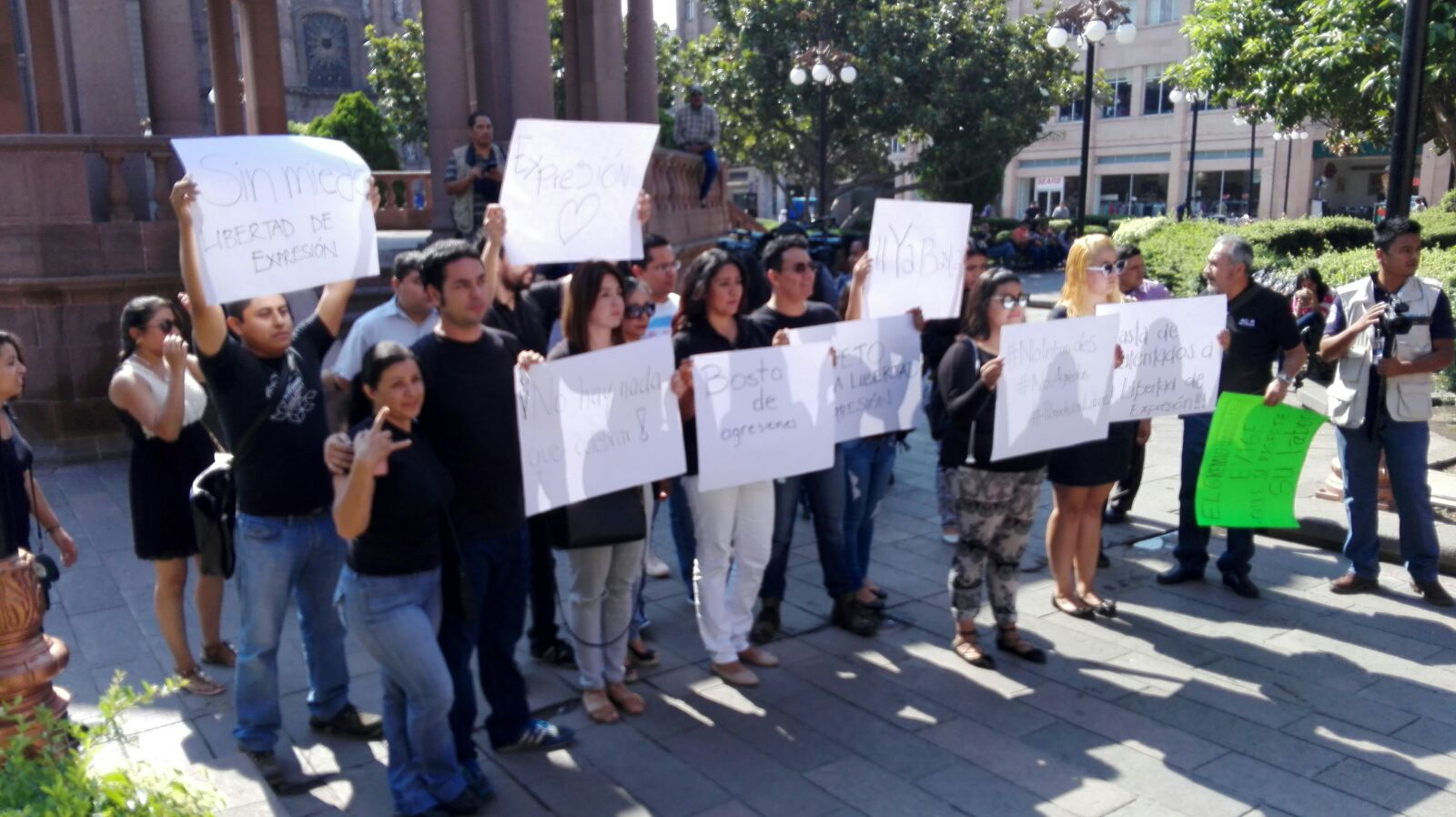 En el marco del Día de la Libertad de Expresión, periodistas potosinos de diversos medios informativos se manifestaron la mañana de este miércoles en la plaza de armas de San Luis Potosí, vestidos principalmente de colores oscuros en señal de luto por los colegas asesinados en otros estados, exigieron respeto a su trabajo y libertad para desempeñar su labor.