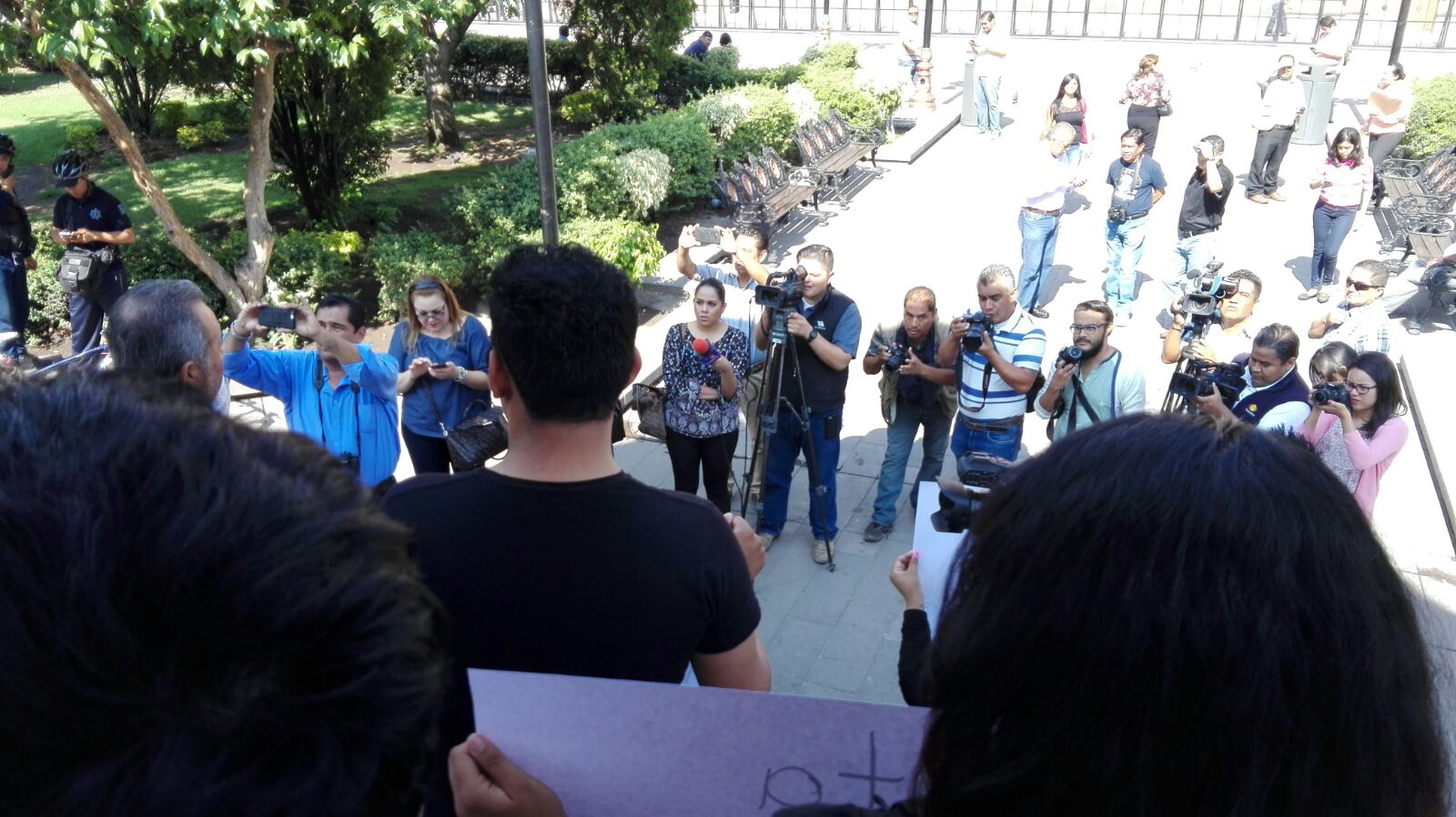Los reporteros y camarógrafos potosinos con pancartas y al grito de “Respeto!” realizaron una caminata silenciosa alrededor de la explanada de la plaza de armas, para después llegar a las afueras de Palacio Municipal en donde tomando como marco las letras gigantes de San Luis Potosí, posaron para las fotos de sus compañeros.