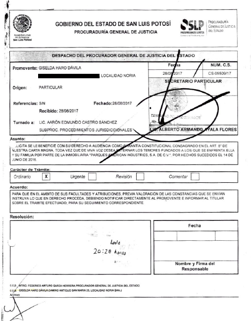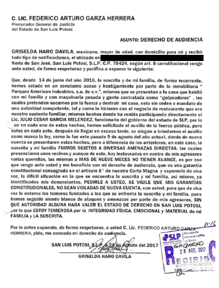 Tras nueve meses de haber denunciado acoso y hostigamiento por parte de la inmobiliaria Parques American Industries S.A. de C.V., la Procuraduría General de Justicia del Estado no ha atendido una solicitud de audiencia con Federico Garza Herrera, titular de la dependencia, a quien los afectados quieren exponer “de viva voz… los temores fundados” que enfrentan.
