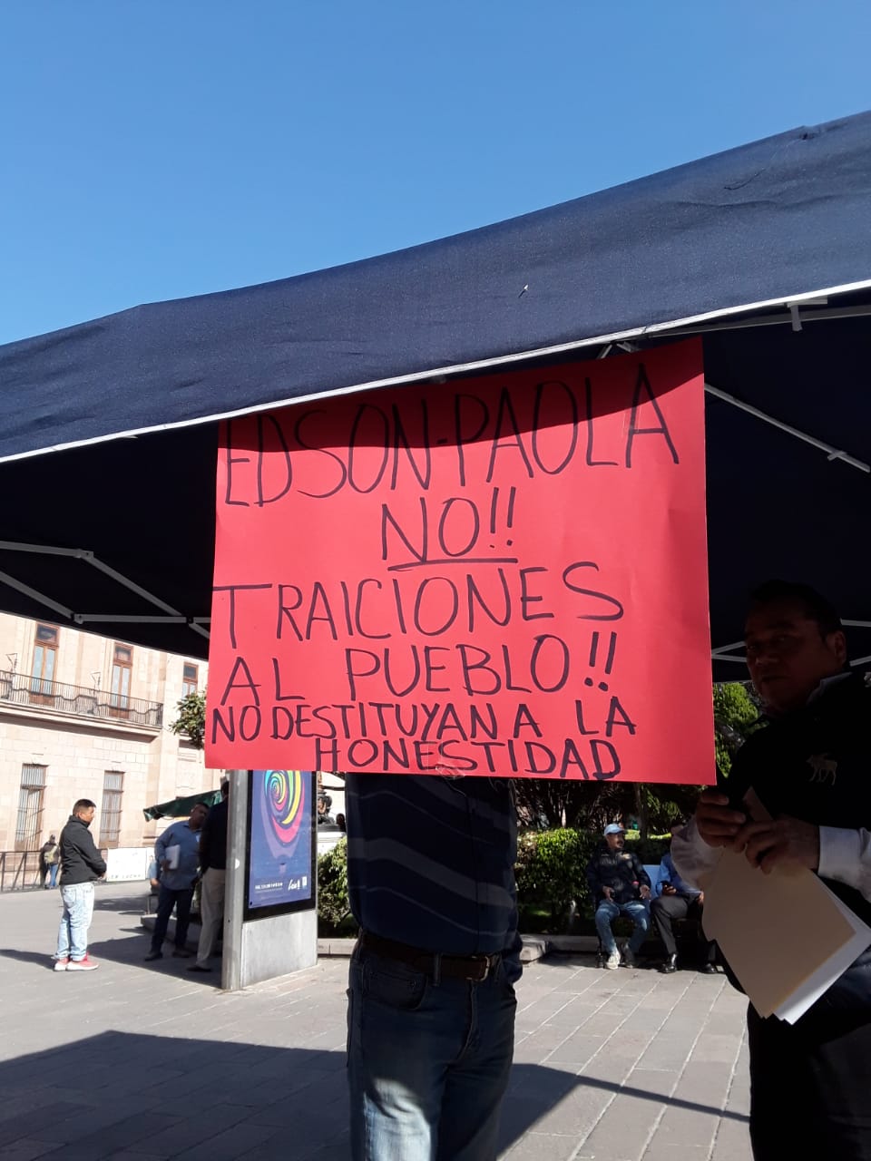 Ya en el recinto legislativo con pancartas en mano comenzaron a gritar: “¡Bety corrupta!, ¡Edson traicionero!, ¡No a la destitución!, ¡No más moches!, ¡Morena no es juguete!, ¡Qué viva la cuarta transformación!, ¡Jucopo corrupta, mil veces corrupta!”.