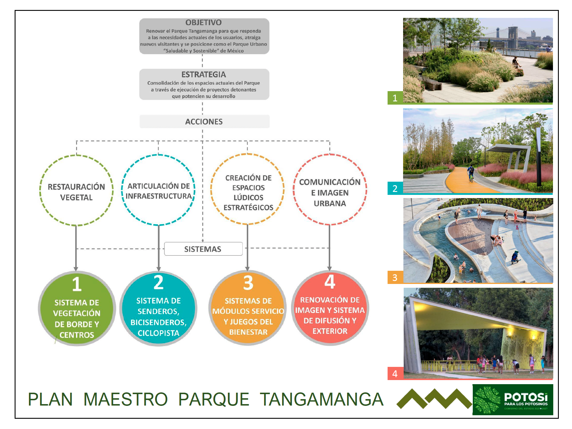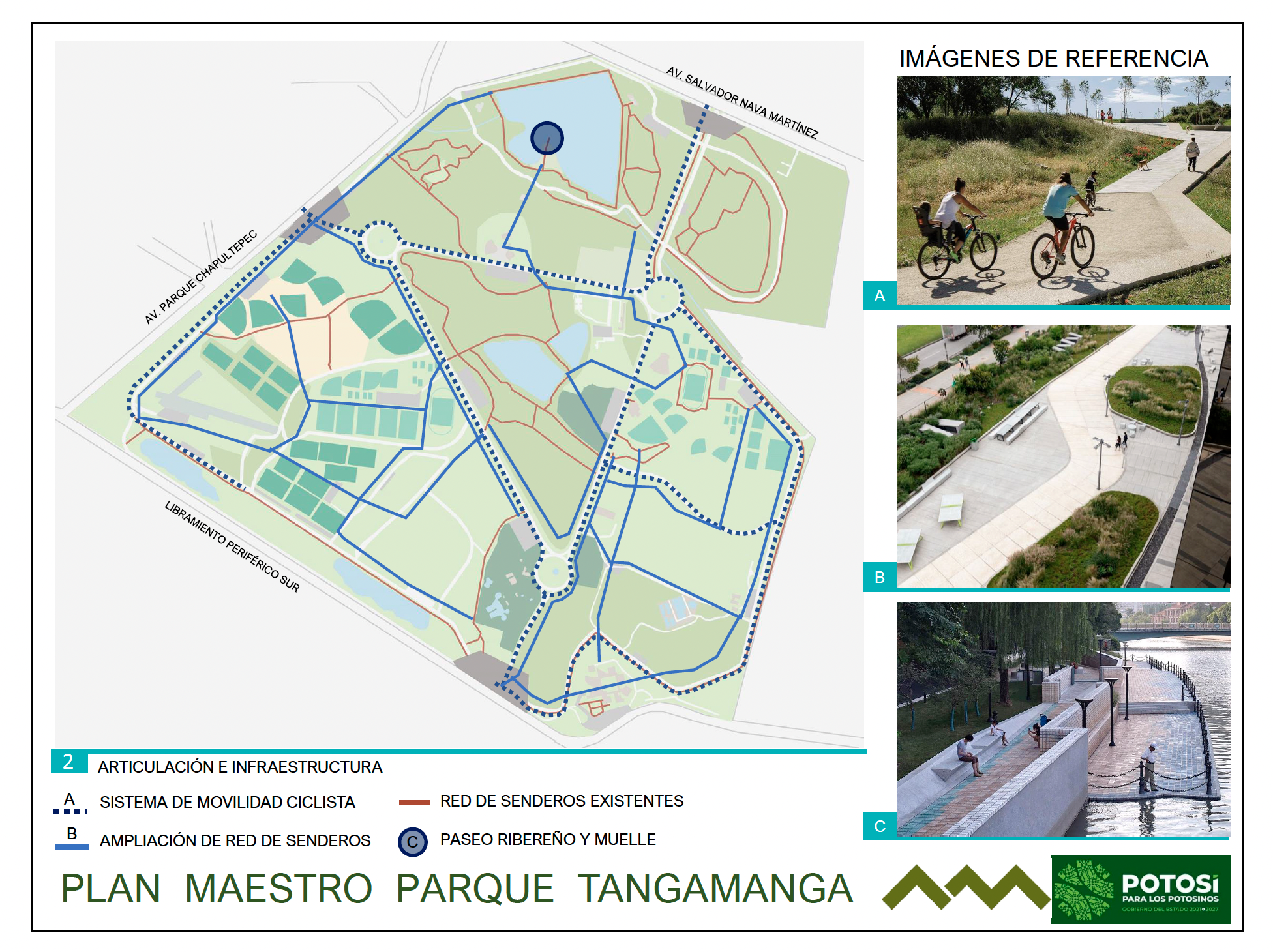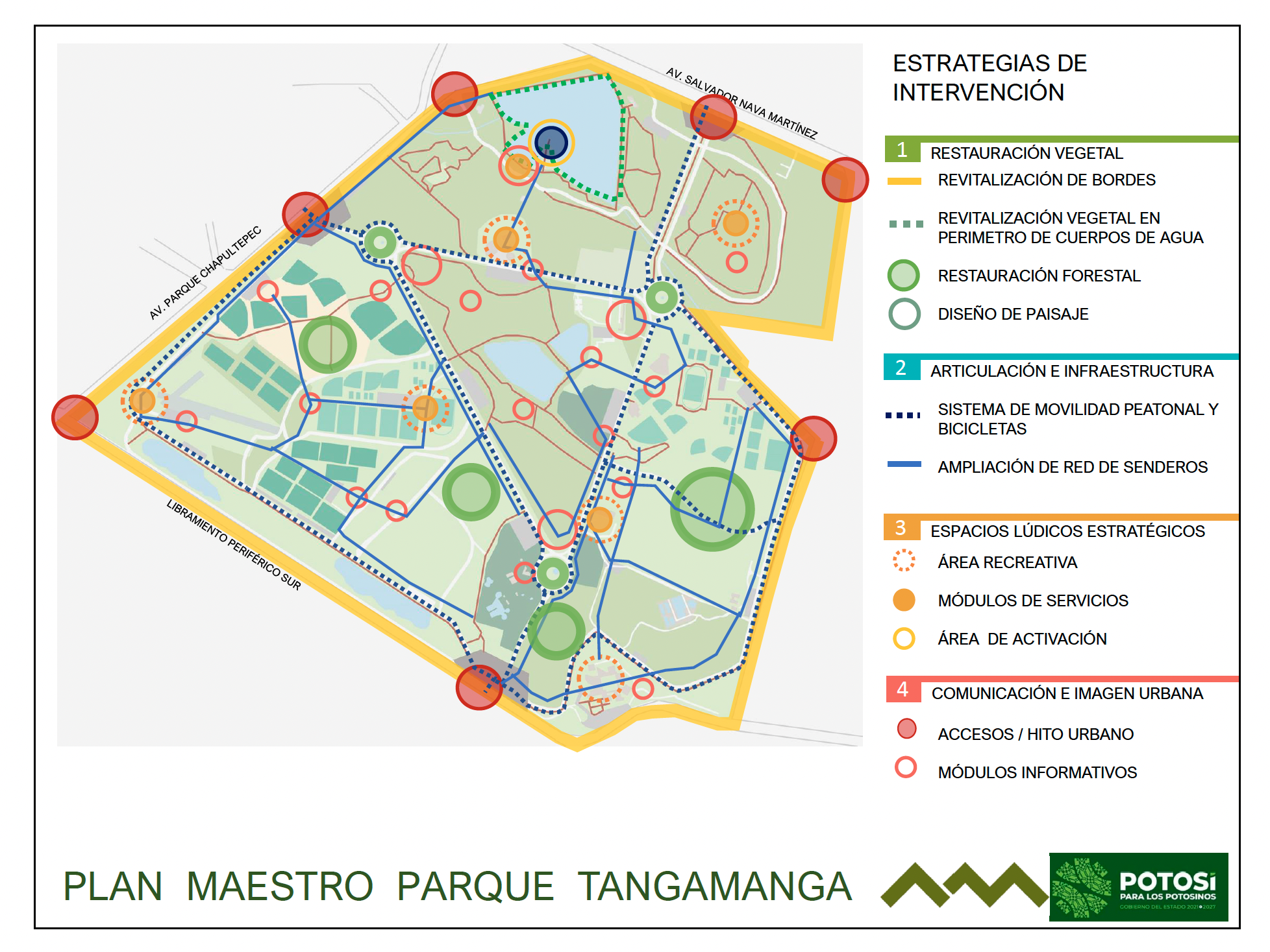 Un documento al que este medio tuvo acceso muestra un plano elaborado entre 2022 y 2023 por una empresa externa, que proponía una reconfiguración integral del parque, distinta a intervenciones de mantenimiento ordinario. El Plan Maestro Tangamanga planteaba convertir el espacio recreativo en un complejo metropolitano multifuncional, combinando la infraestructura existente con una renovación estratégica.