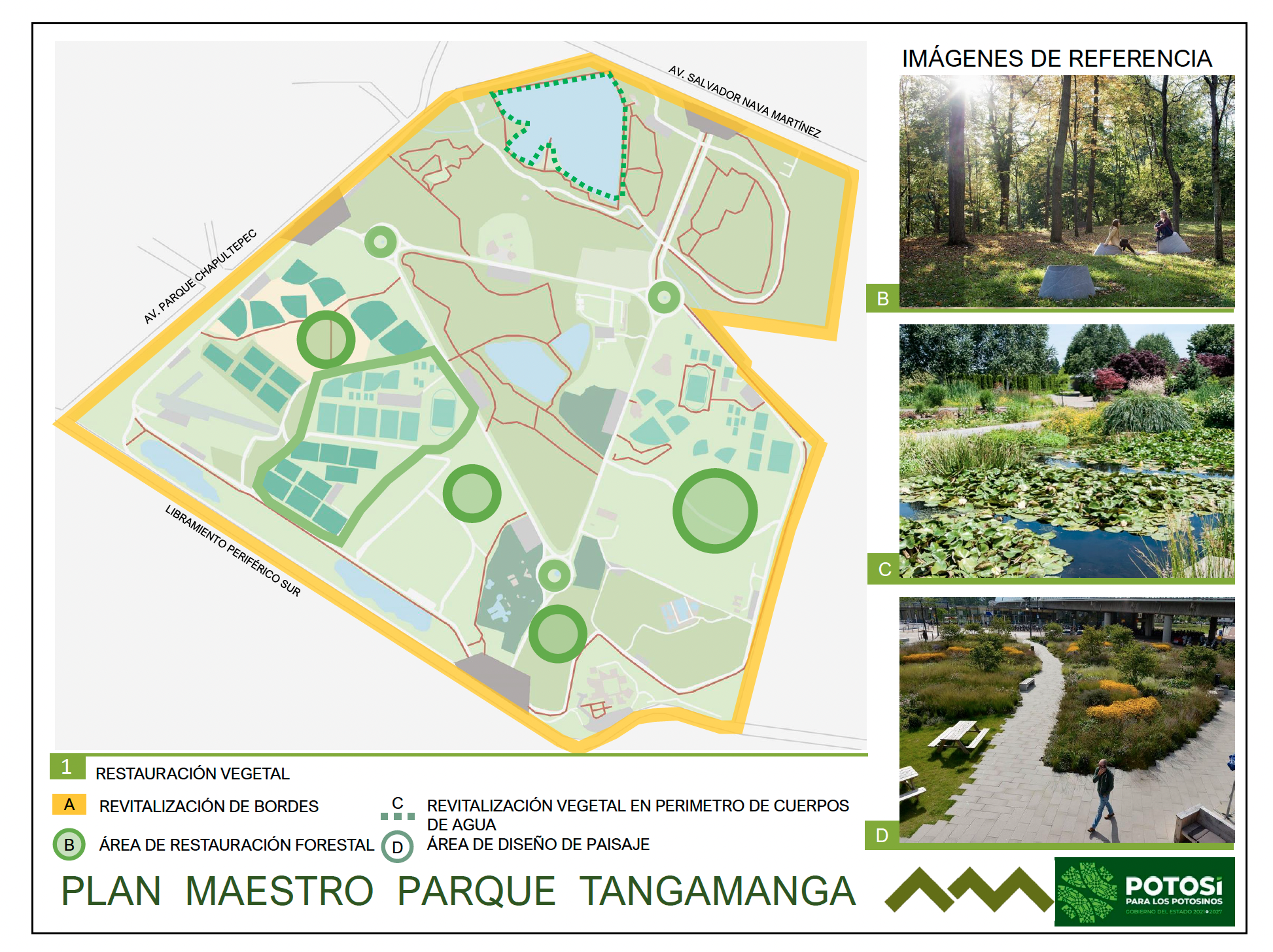 Aunque el Plan Maestro no detalla qué especies se privilegiarían, sí planteaba como objetivo posicionar al Tangamanga I como un parque urbano saludable y sostenible, entendido como un espacio capaz de mantener su ecosistema a largo plazo sin comprometer sus recursos naturales.