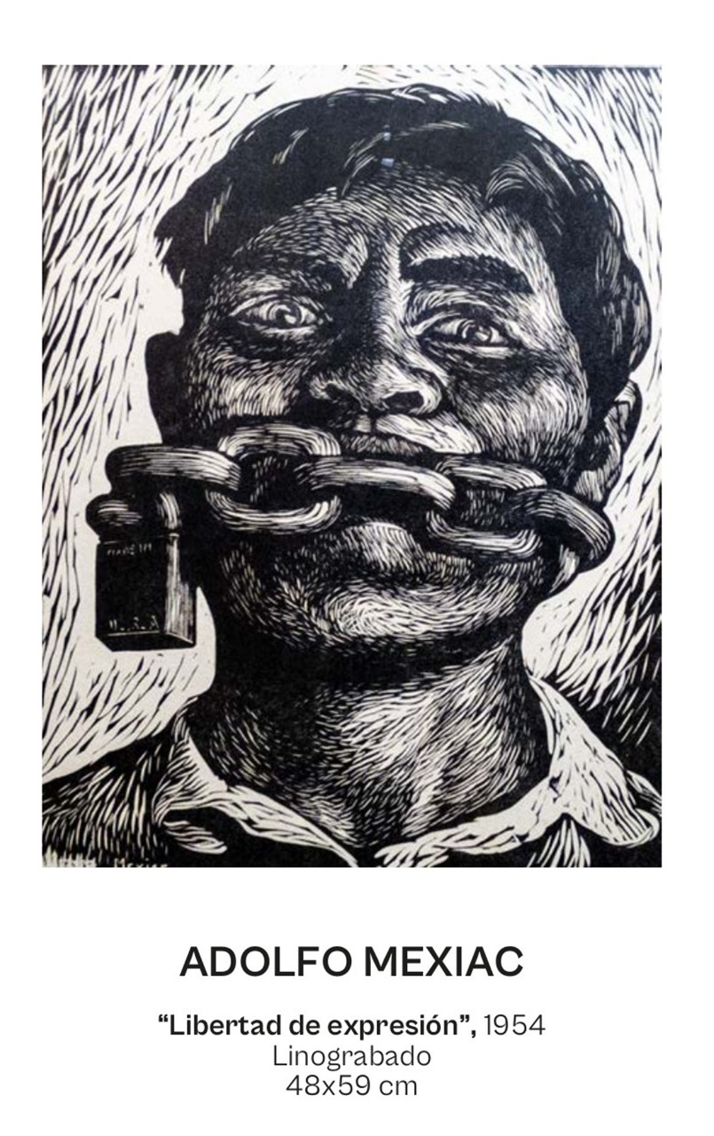 Sobre la pared cuelga el linograbado famoso de Adolfo Mexiac que representa a un joven con unas cadenas y un candado silenciando su boca, símbolo de la censura y la represión. Libertad de expresión tituló en 1954 esta obra el artista nacido en Michoacán —creada en el contexto del golpe militar en Guatemala auspiciado por Estados Unidos— y convertida en un ícono del movimiento estudiantil de 1968 en México, parte esencial de la gráfica de aquella lucha.