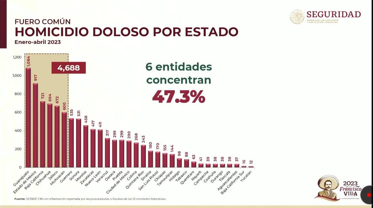 El mandatario evidenció que de enero a abril, el 47.3 por ciento de los casos de homicidio se concentró en seis entidades, de las cuales San Luis Potosí no forma parte.
